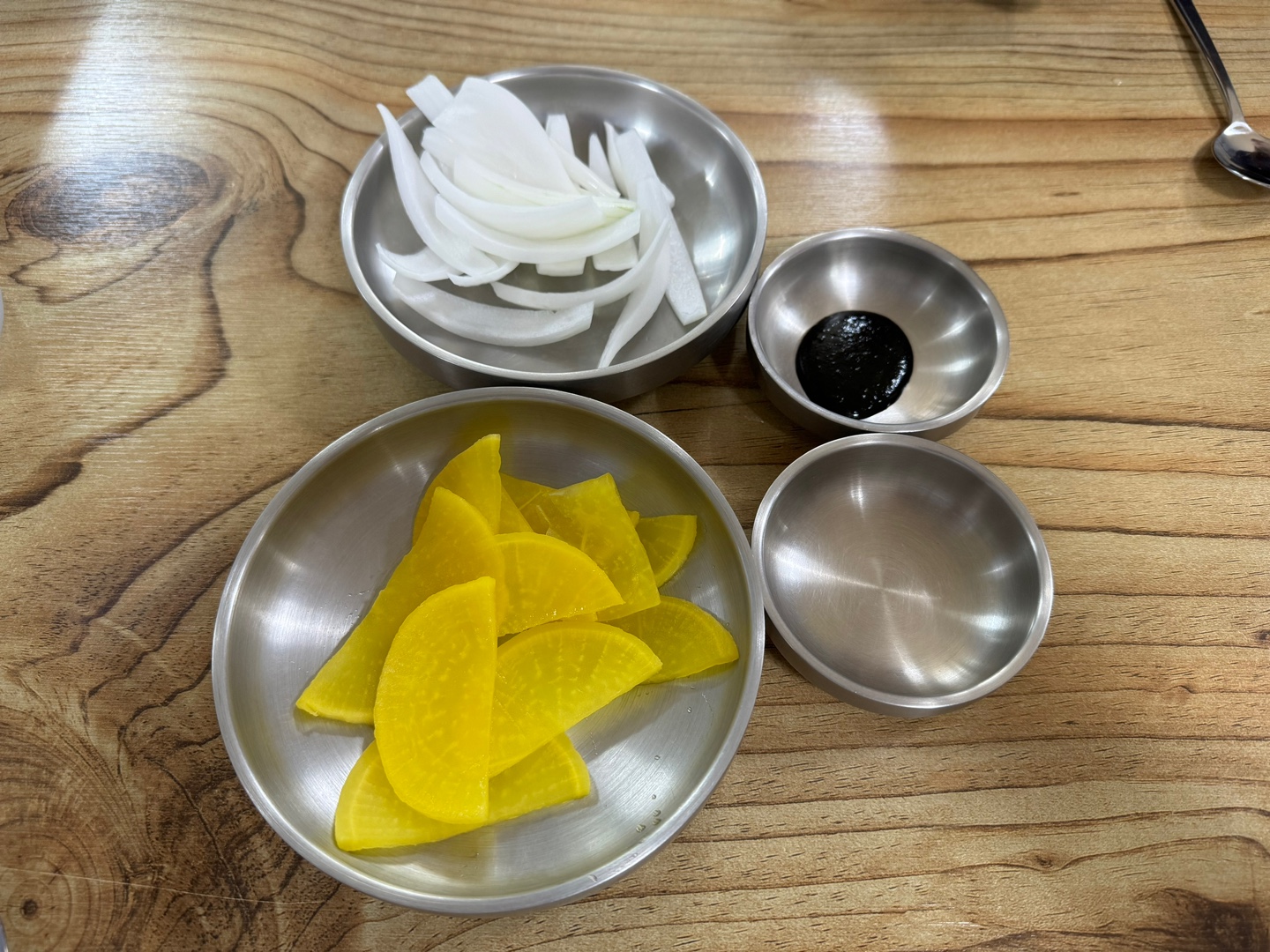 생양파와 춘장, 단무지가 기본으로 나옵니다. 생양파가 맵지 않고 아삭한 식감과 은은히 단맛이 좋았습니다.