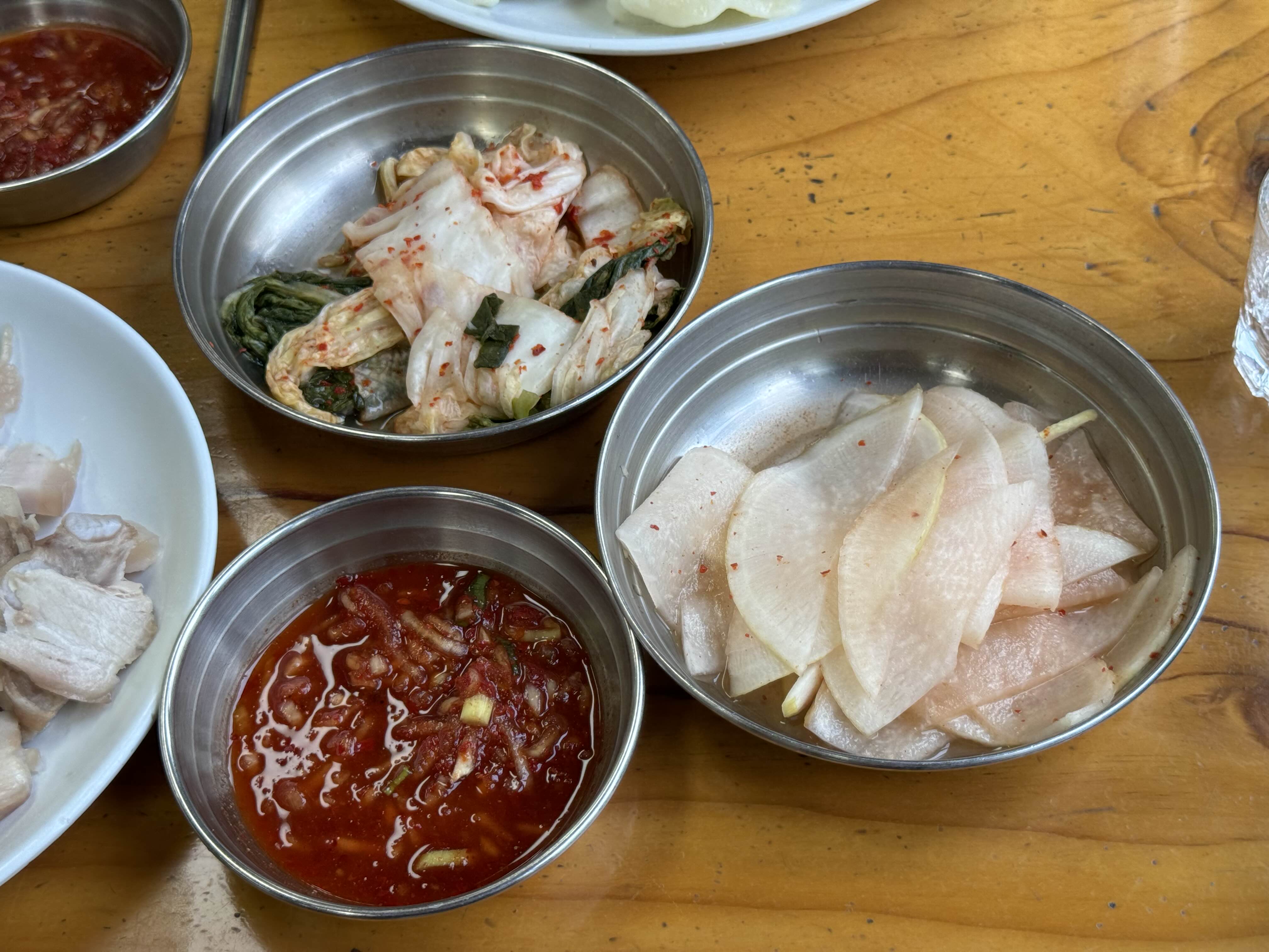 무절임과 김치가 나오고 제육을 주문해서 제육을 찍어먹는 양념장도 나옴. 무절임과 배추김치는 슴슴한편이고 제육장이 상당히 감칠맛이 좋아 맛있음. 냉면 면을 비벼먹어도 맛있음.