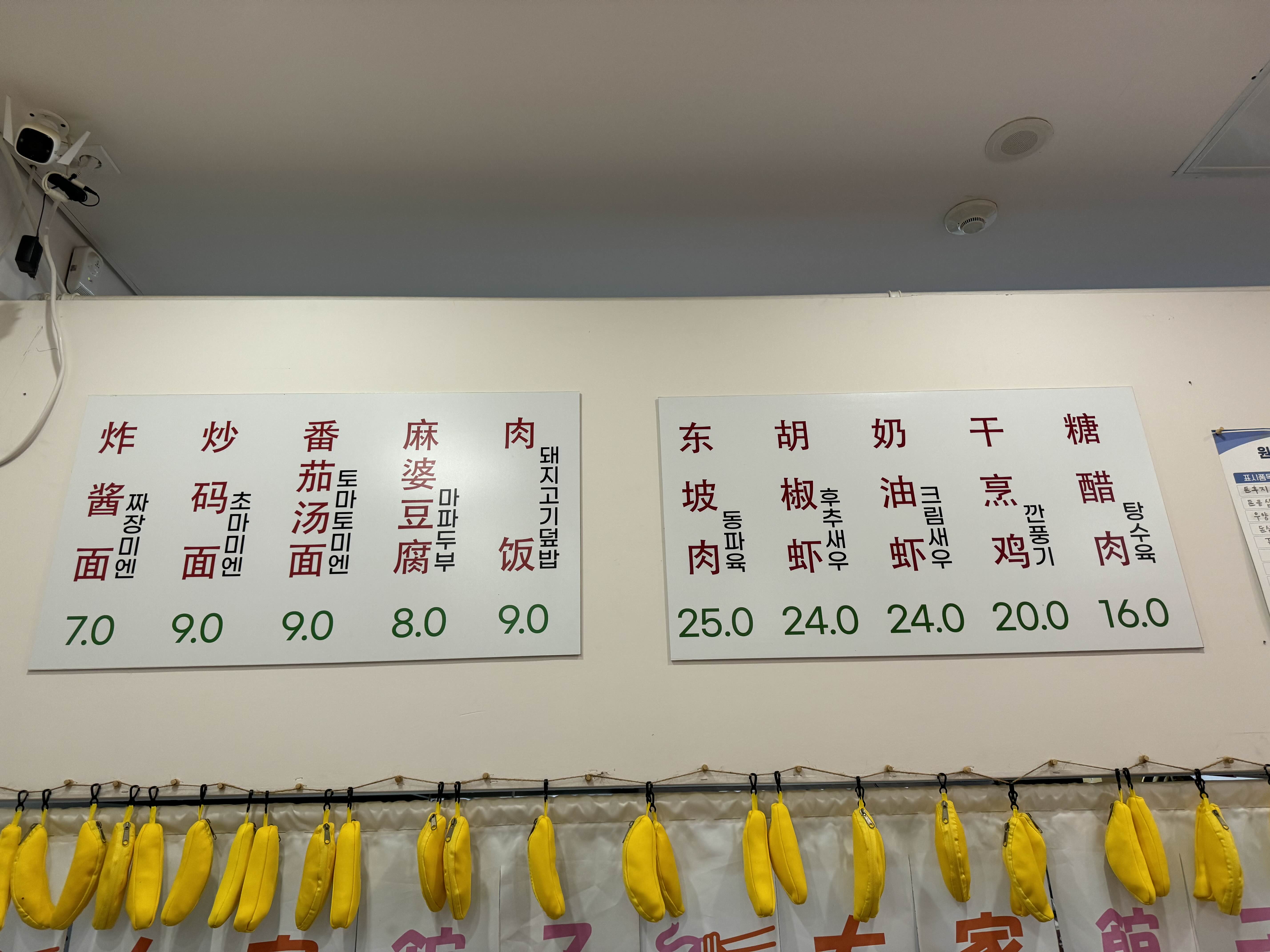 짜장면, 초마면, 토마토면, 마파두부, 돼지고기덮밥의 식사메뉴와 동파육, 후추새우, 크림새우, 깐풍기, 탕수육의 요리메뉴로 나눠 판매중입니다.