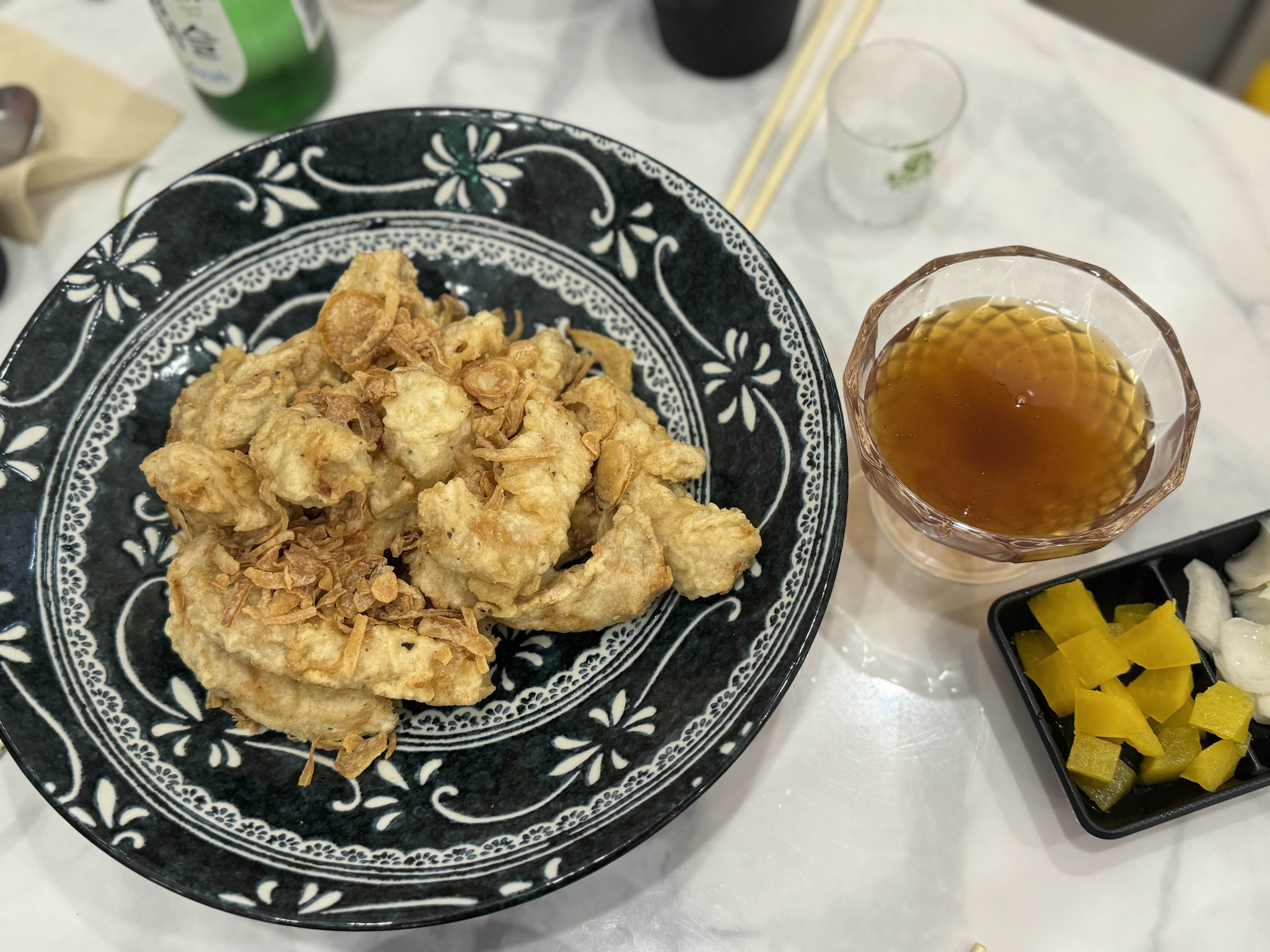 탕수육은 튀김옷이 없다시피할 정도로 튀김옷이 매우 얇고 고기가 정말 두툼합니다. 탕수육 고기는 육즙도 많고 튀김 정도도 아주 좋습니다. 탕수육에는 양파플레이크가 같이 있는데 바삭하고 고소한 양파맛이 좋습니다. 소스에는 딱 소스만 들어있습니다.