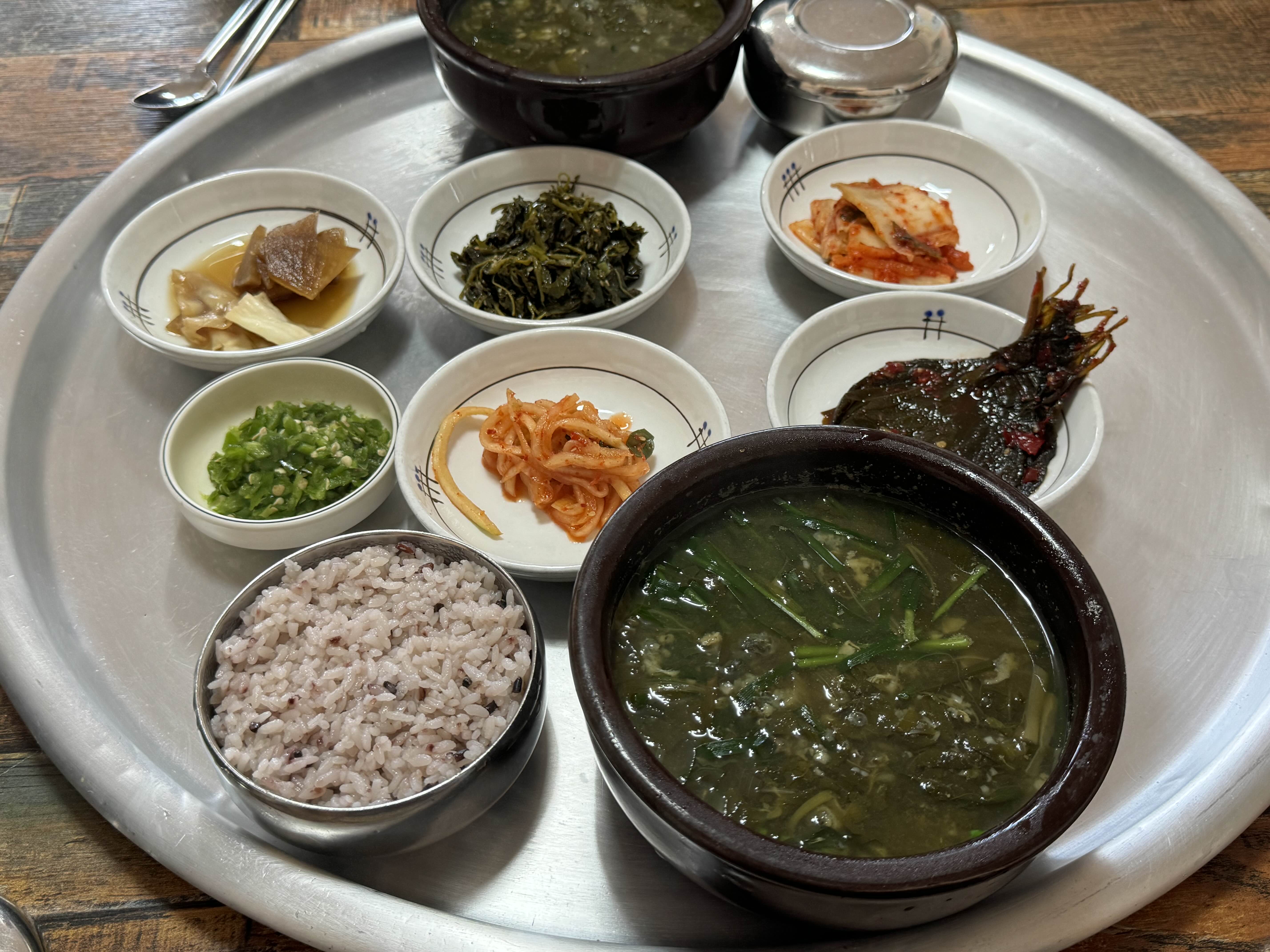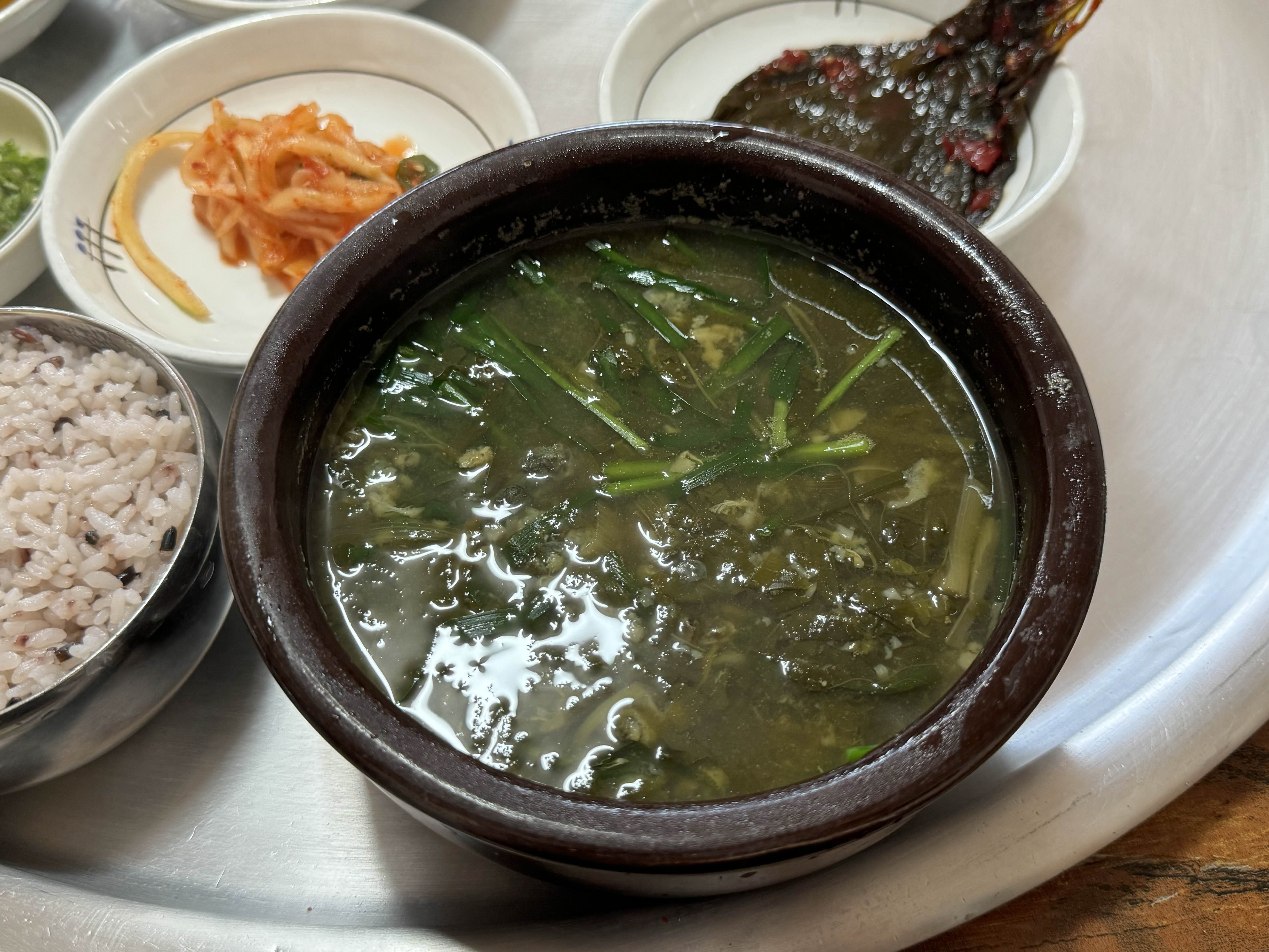 구수한 냄새가 아주 좋은 올갱이국입니다. 보통 시래기를 쓰는 다른 식당과 달리 괴산의 올갱이해장국집들은 아욱을 넣고 끓인다는데 그래서 구수한 된장과 잘 어울립니다.