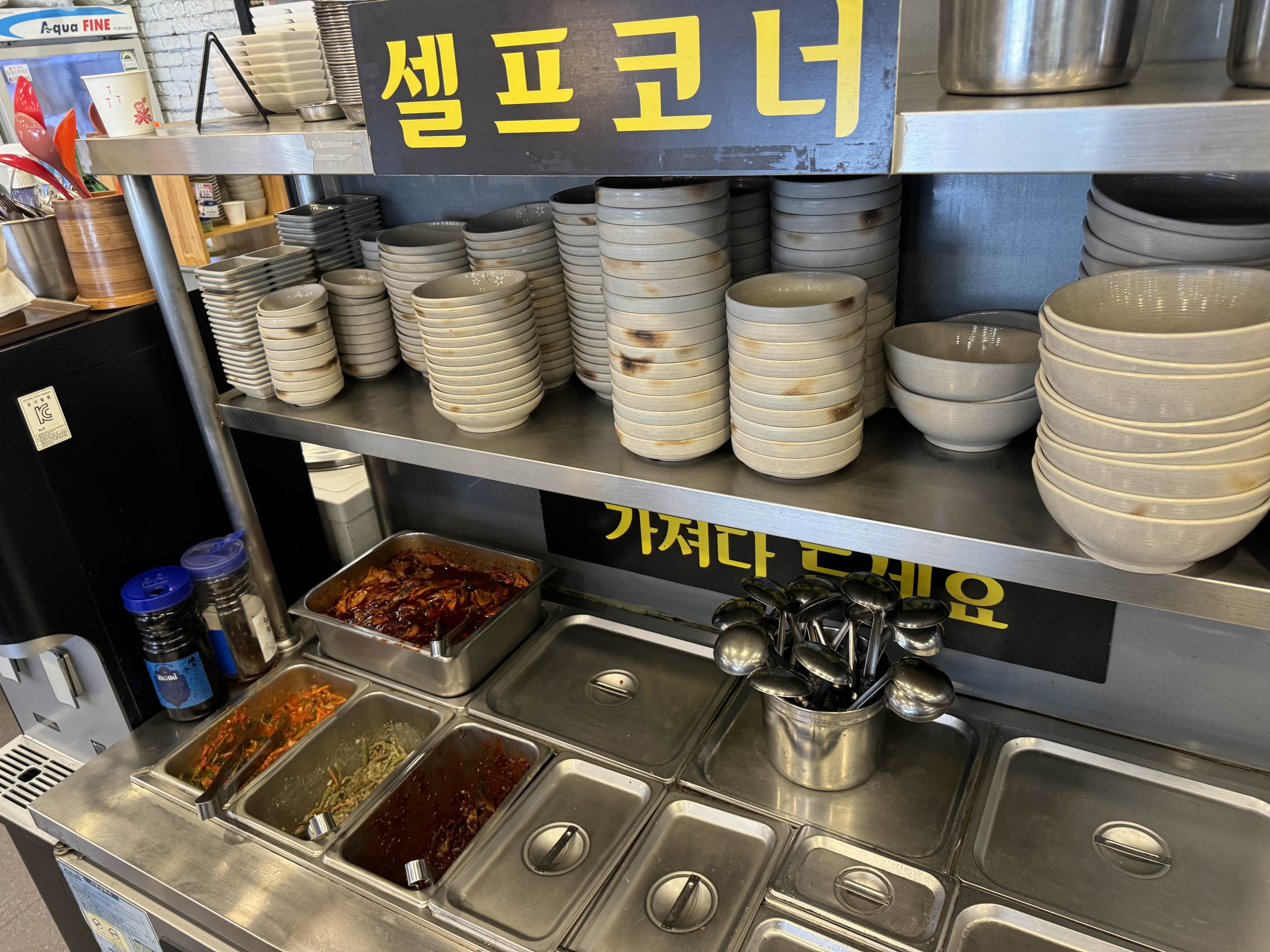 기본찬은 가게 한켠에 있는 셀프코너에서 가져와먹으면 됩니다. 쌈채소는 없는데 쌈채소는 요청하면 가져다 주시는 것 같습니다.