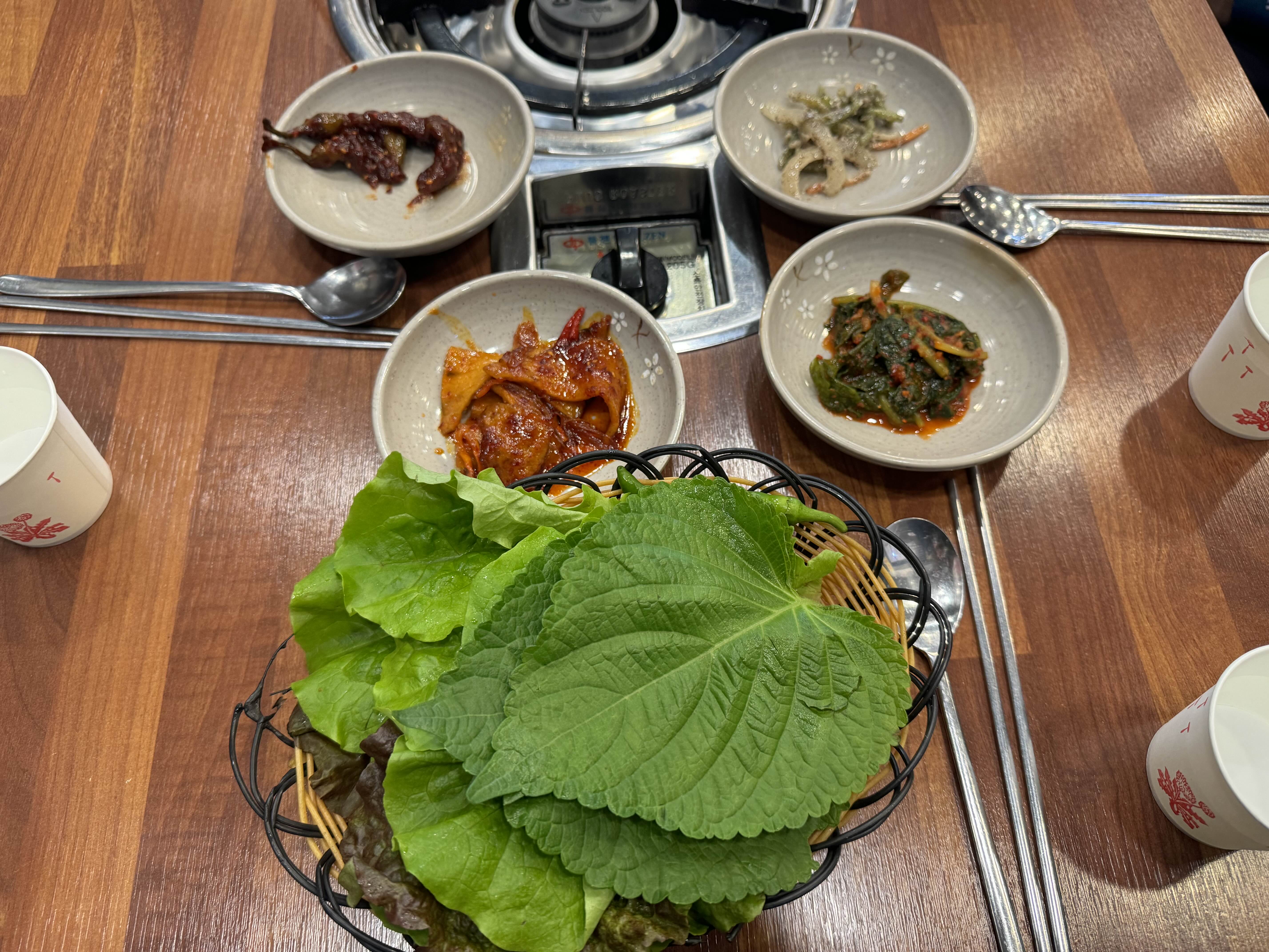 기본찬으로 어묵, 고추, 열무김치 등이 나왔습니다. 열무김치는 달달하고 나머지 반찬은 깔끔한 맛이 괜찮았습니다. 제육볶음을 주문해서 적상추와 청상추, 깻잎, 고추가 같이 나왔습니다.