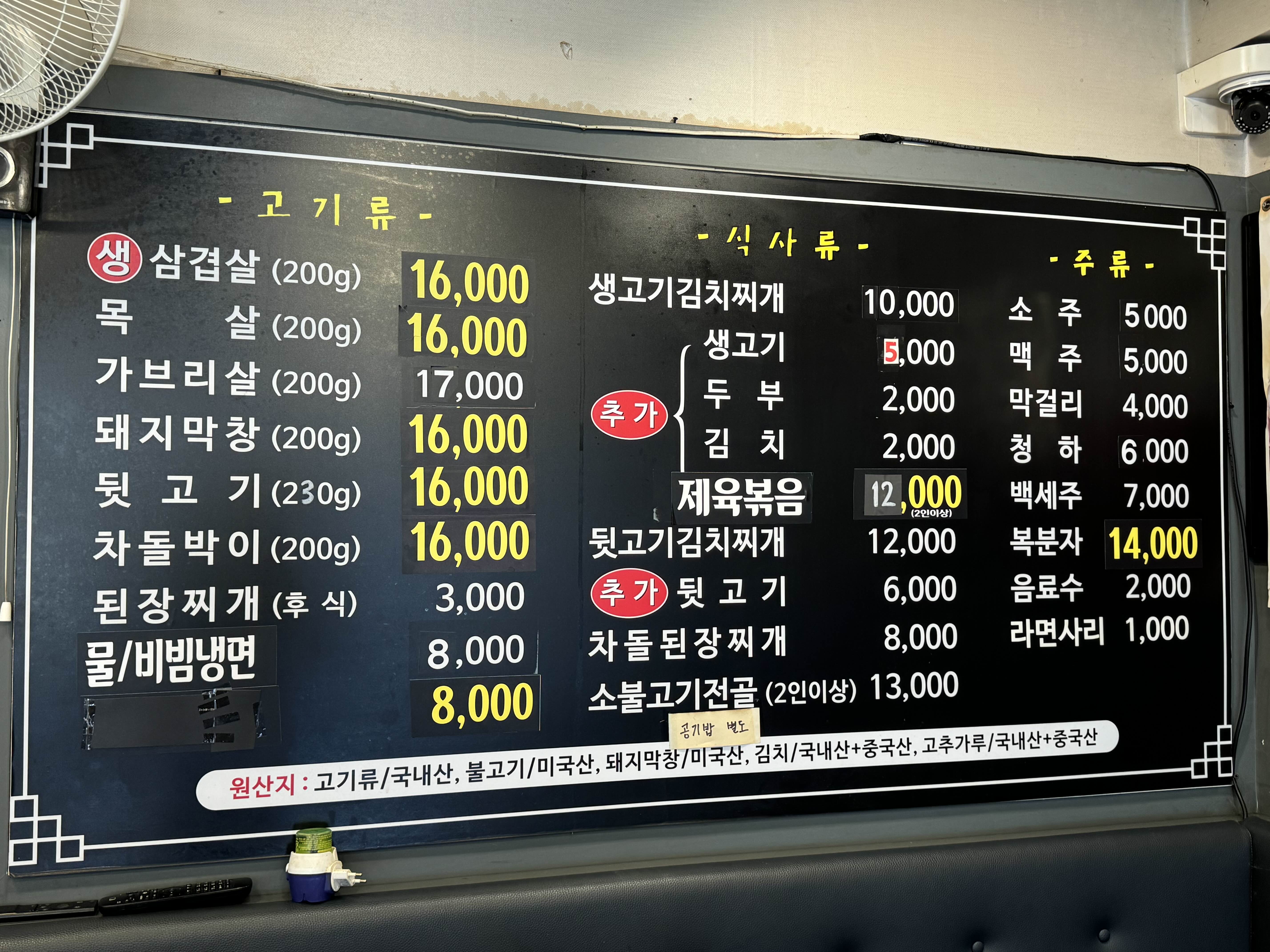 고기류와 식사류로 나뉘어져있고 점심에는 고기손님보다는 식사손님이 많습니다. 생고기 김치찌개, 뒷고기 김치찌개, 차돌 된장찌개, 소불고기전골, 제육볶음이 식사메뉴로 있습니다.
