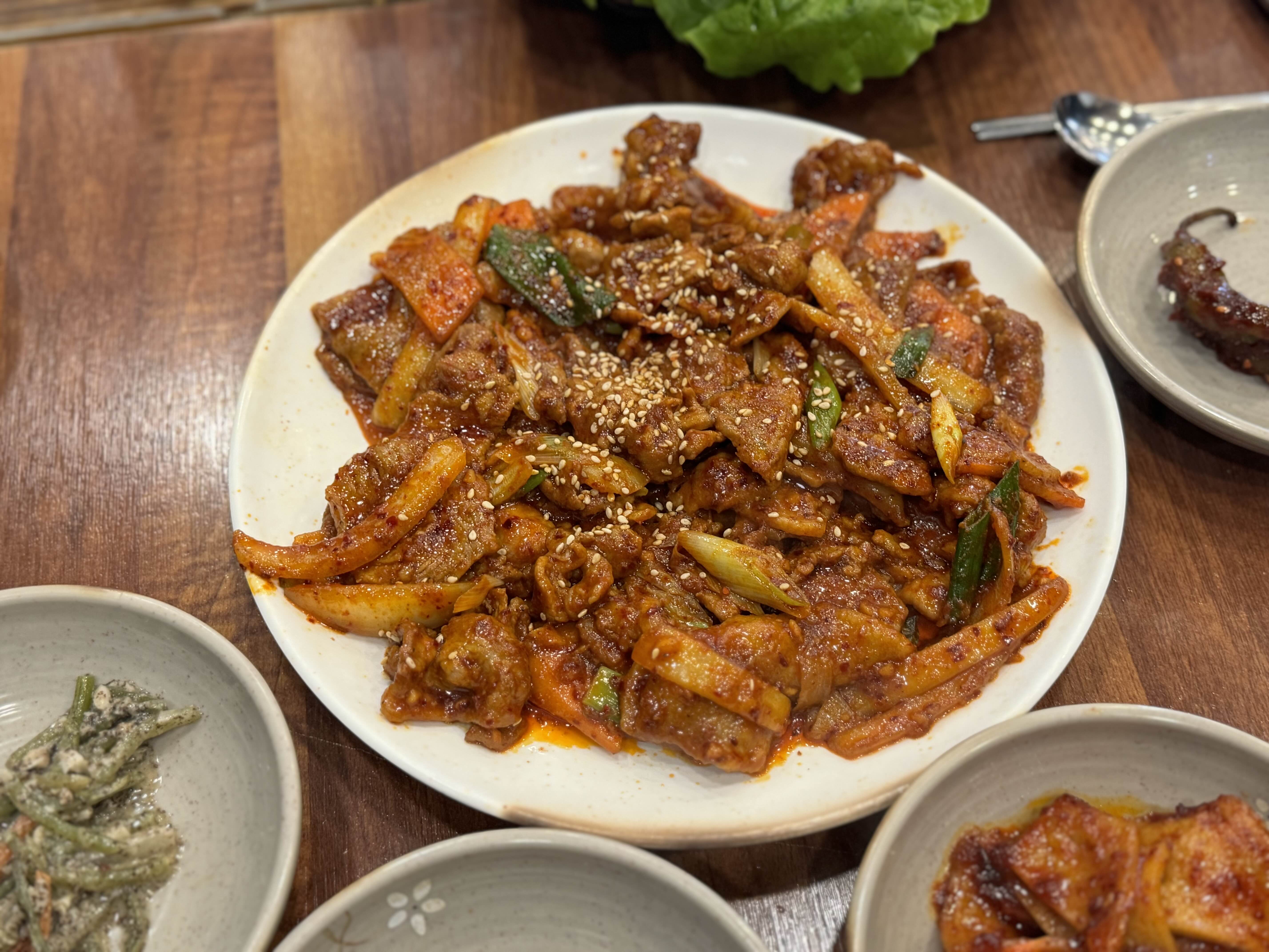 제육볶음 2인분의 양이 아주 많습니다. 은은한 불향이 나고 양념은 살짝 매콤한 편으로 많이 맵지 않고 깔끔한 맛입니다. 밥반찬으로 아주 좋을 간입니다. 돼지의 잡내도 나지 않고 같이 있는 채소들도 맛이 잘 어울렸습니다.