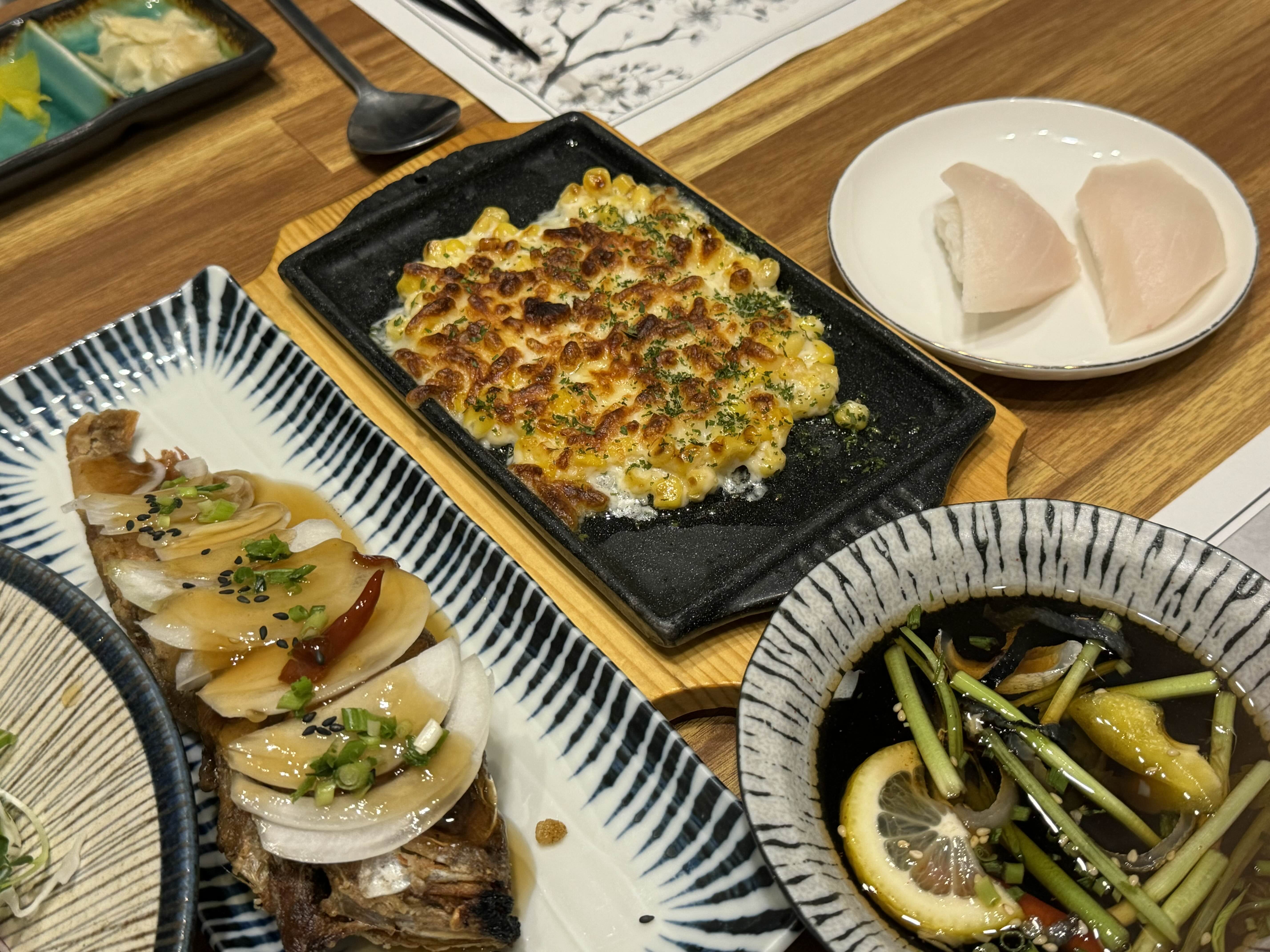 뒤이어 생선구이와 콘치즈, 황새치뱃살로 보이는 초밥이 나왔습니다. 밑반찬이 다 괜찮게 나와 38,000원 짜리 메뉴인데도 만족감이 컸습니다.