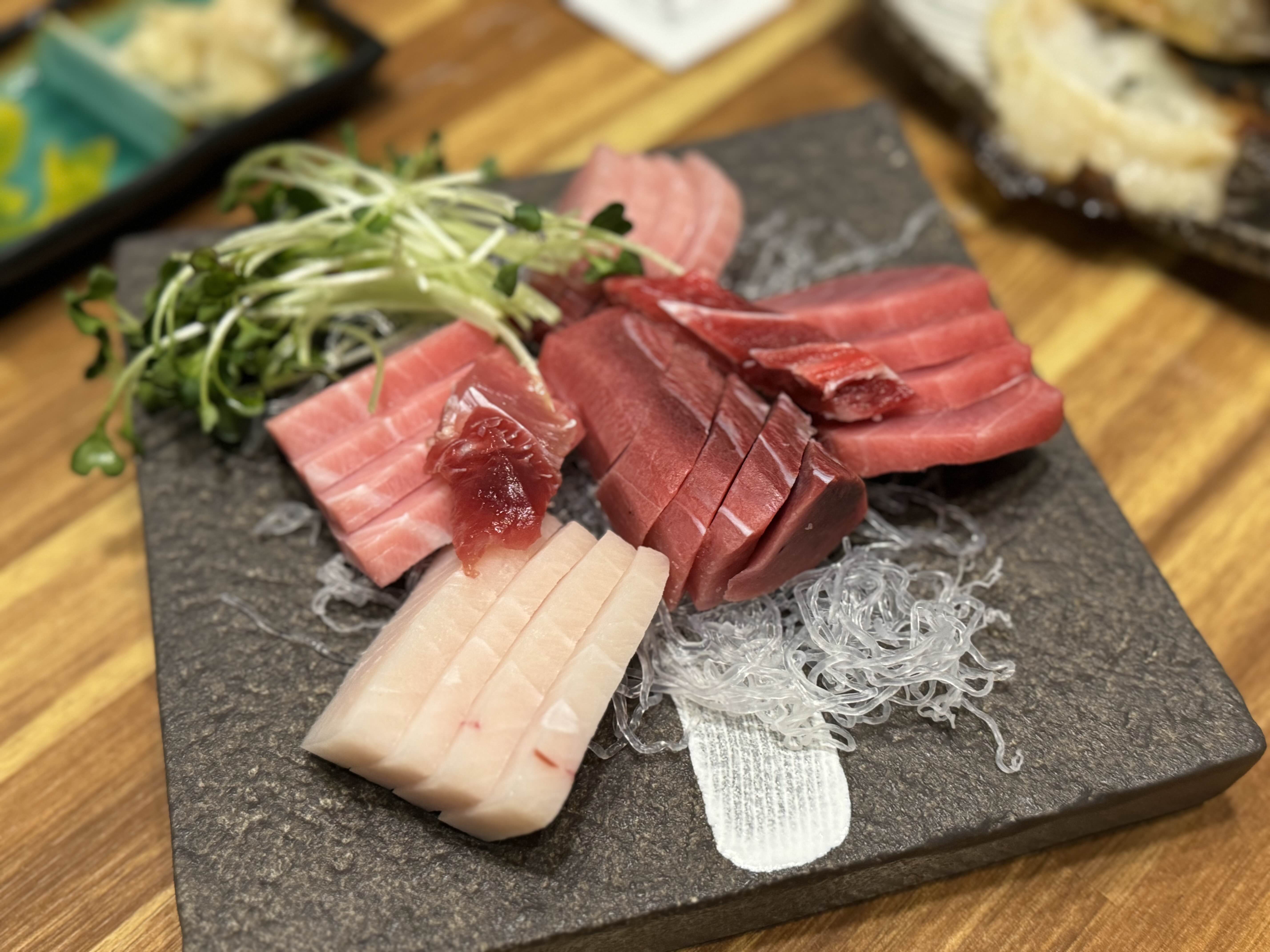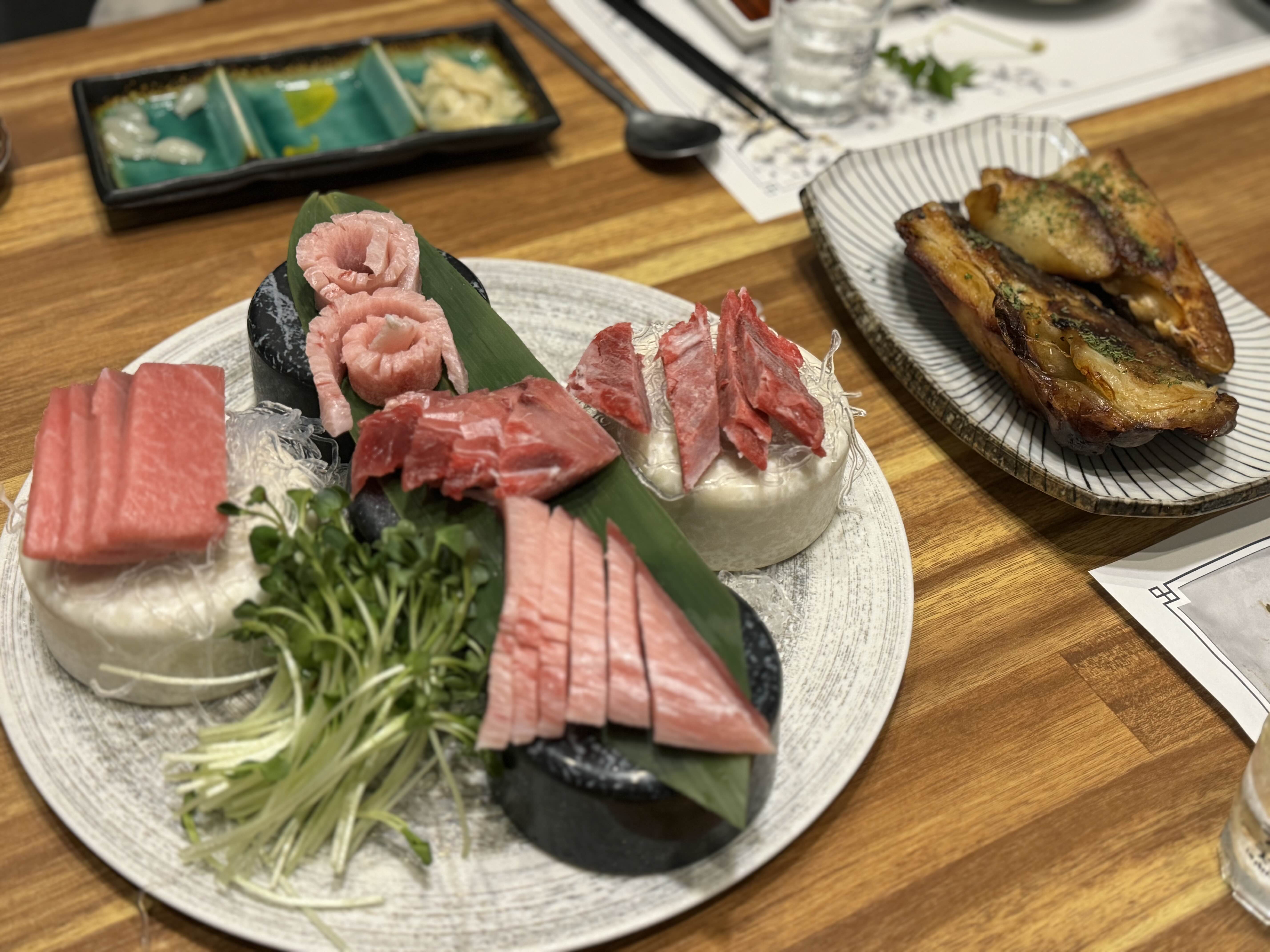 첫번째 참치 접시가 나왔습니다. 하나당 한점씩 먹을 수 있게 나와 인당 8점 정도 입니다. 황새치 뱃살과 눈다랑어 뱃살, 참다란어 속살과 참다랑어 뱃살도 나오는 등 첫 접시의 퀄리티가 좋았습니다.
