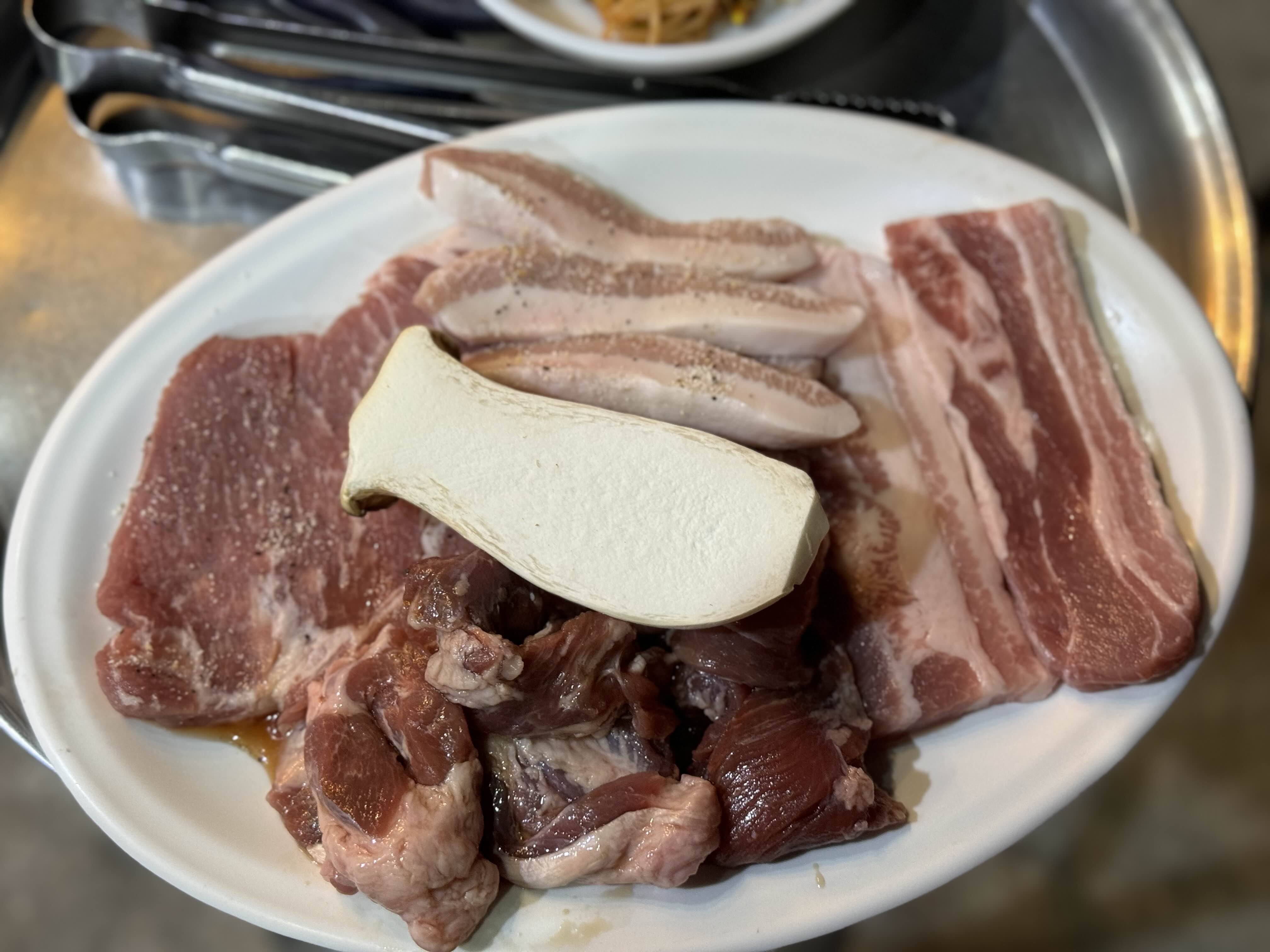 삼겹살, 항정살, 목살, 갈매기살이 나오는 송학모듬입니다. 12시부터 시계방향으로 항정살, 삼겹살, 갈매기살, 목살입니다. 새송이버섯도 큼지막하게 반개 나옵니다.