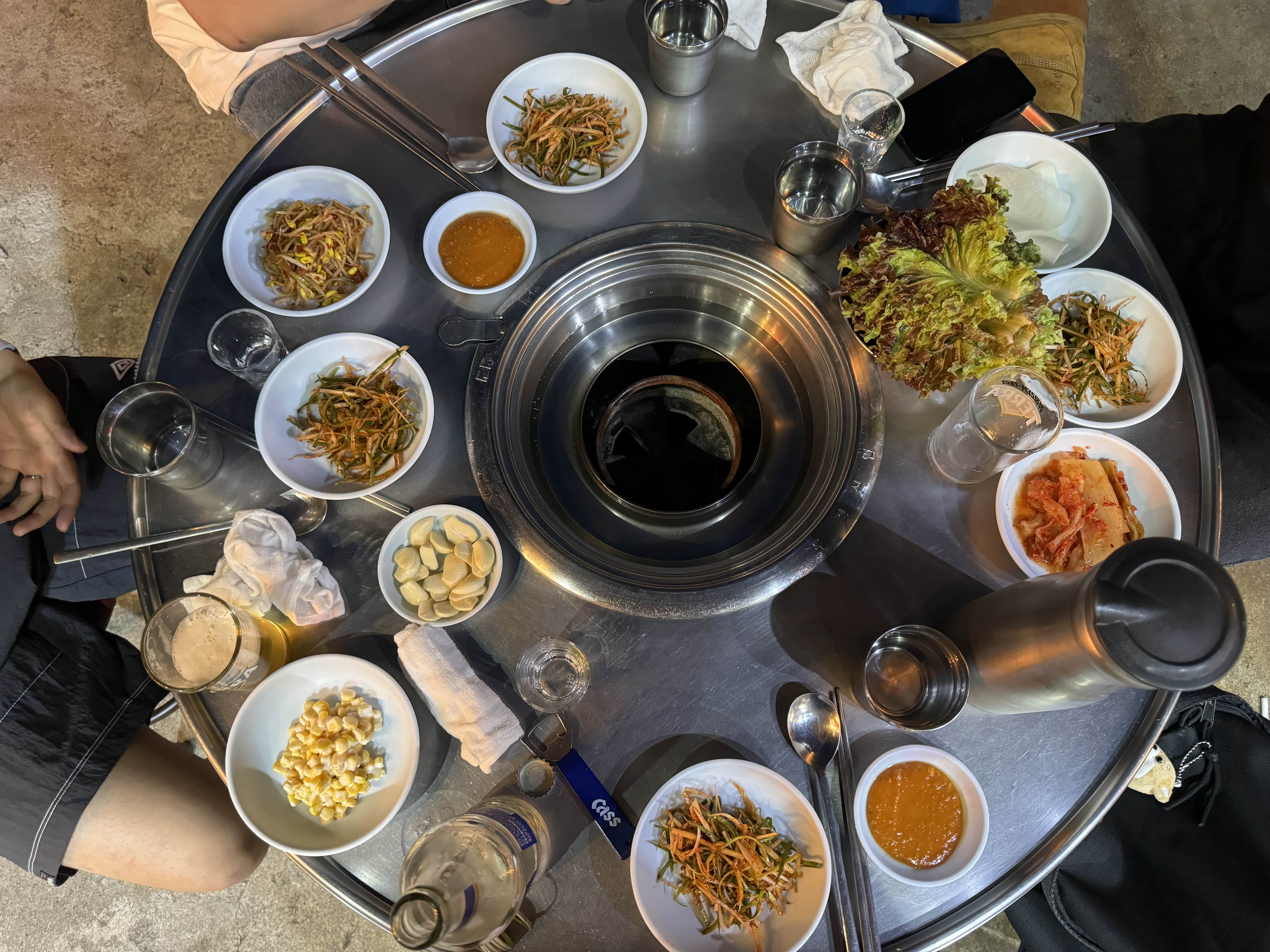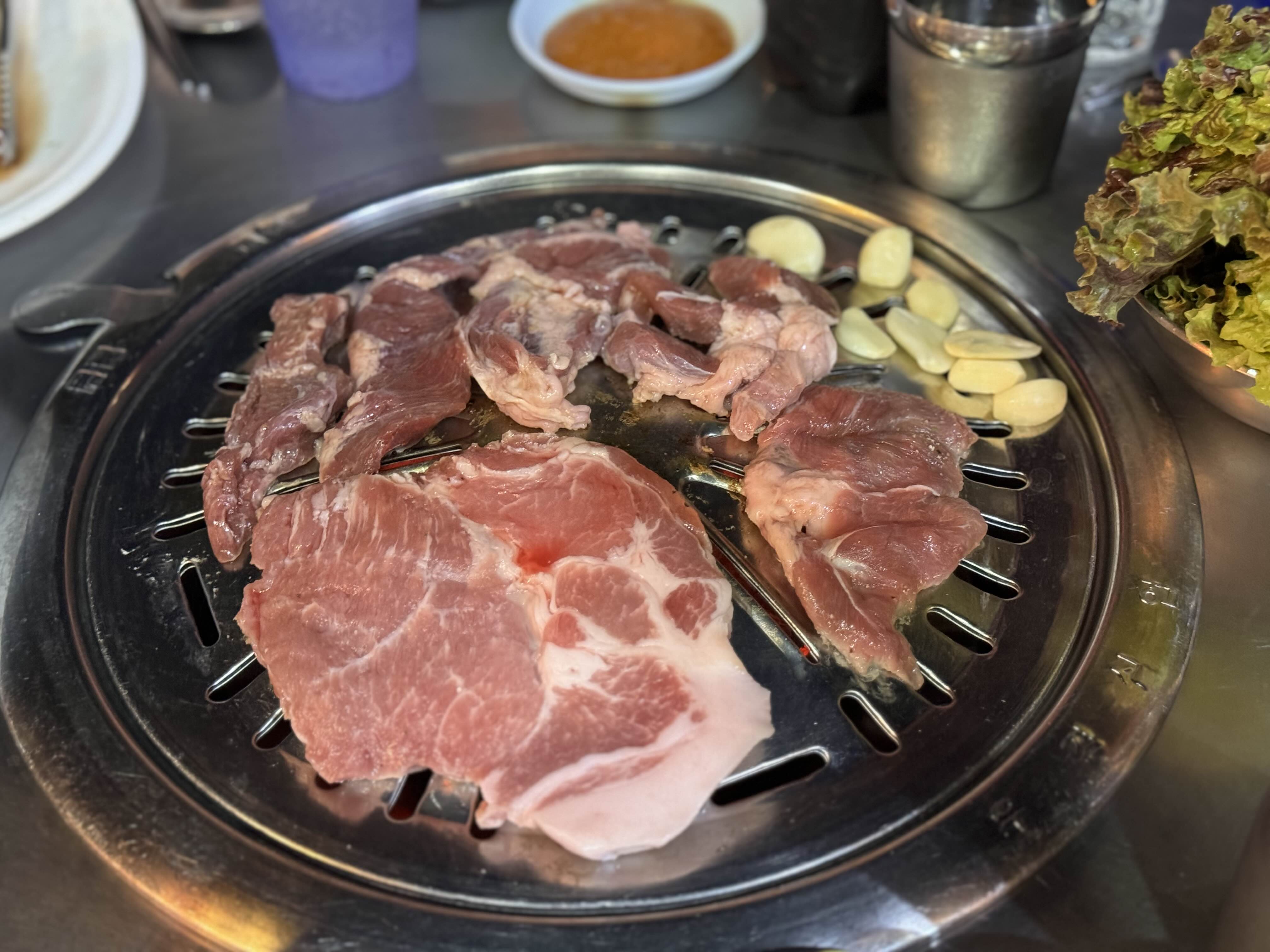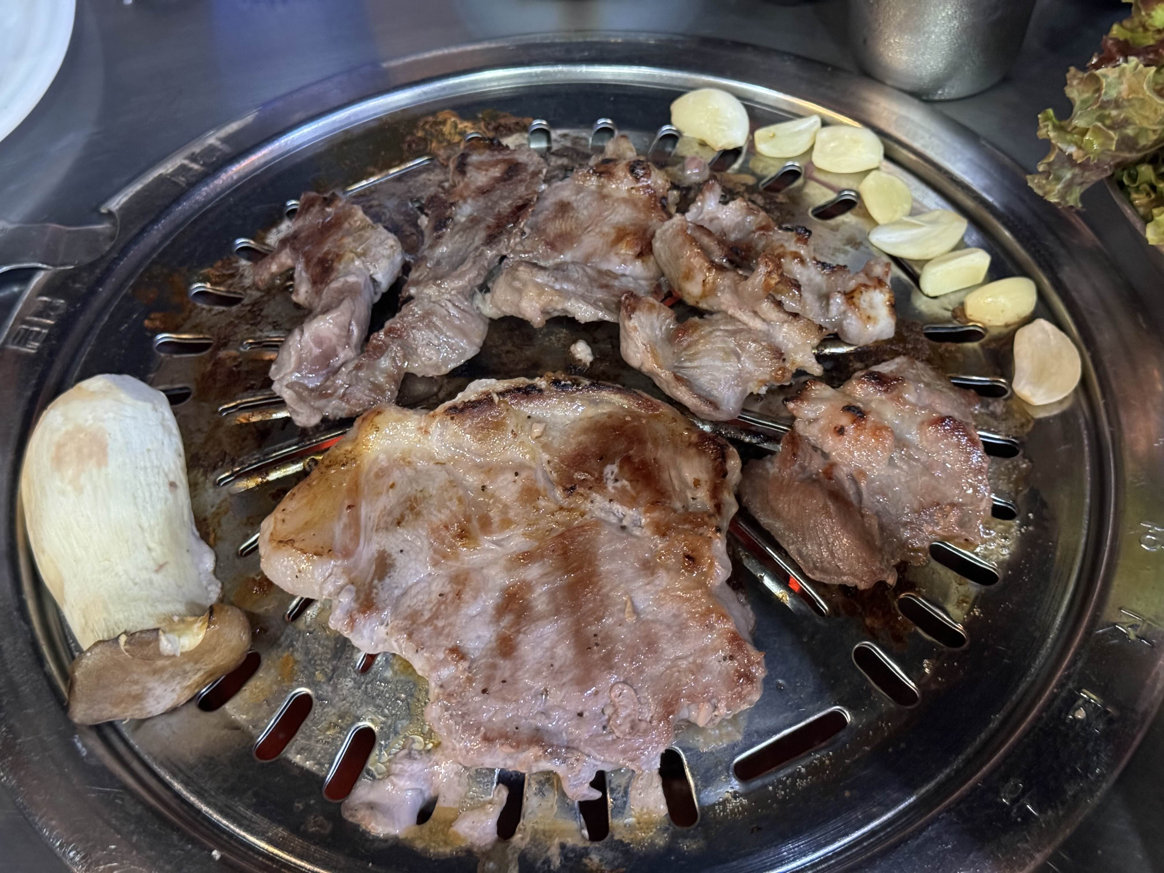 고기는 얇은편으로 엄청 맛있는 맛은 아니지만 가격대비 상당히 괜찮은 맛입니다. 비싸고 구워주고 입에 살살 녹는 그런 고기 맛을 원하시면 이런 곳에 오면 안됩니다. 맛이 떨어지지 않는 저렴한 고기에 소주한잔하기에 딱 좋은 그런 맛입니다.