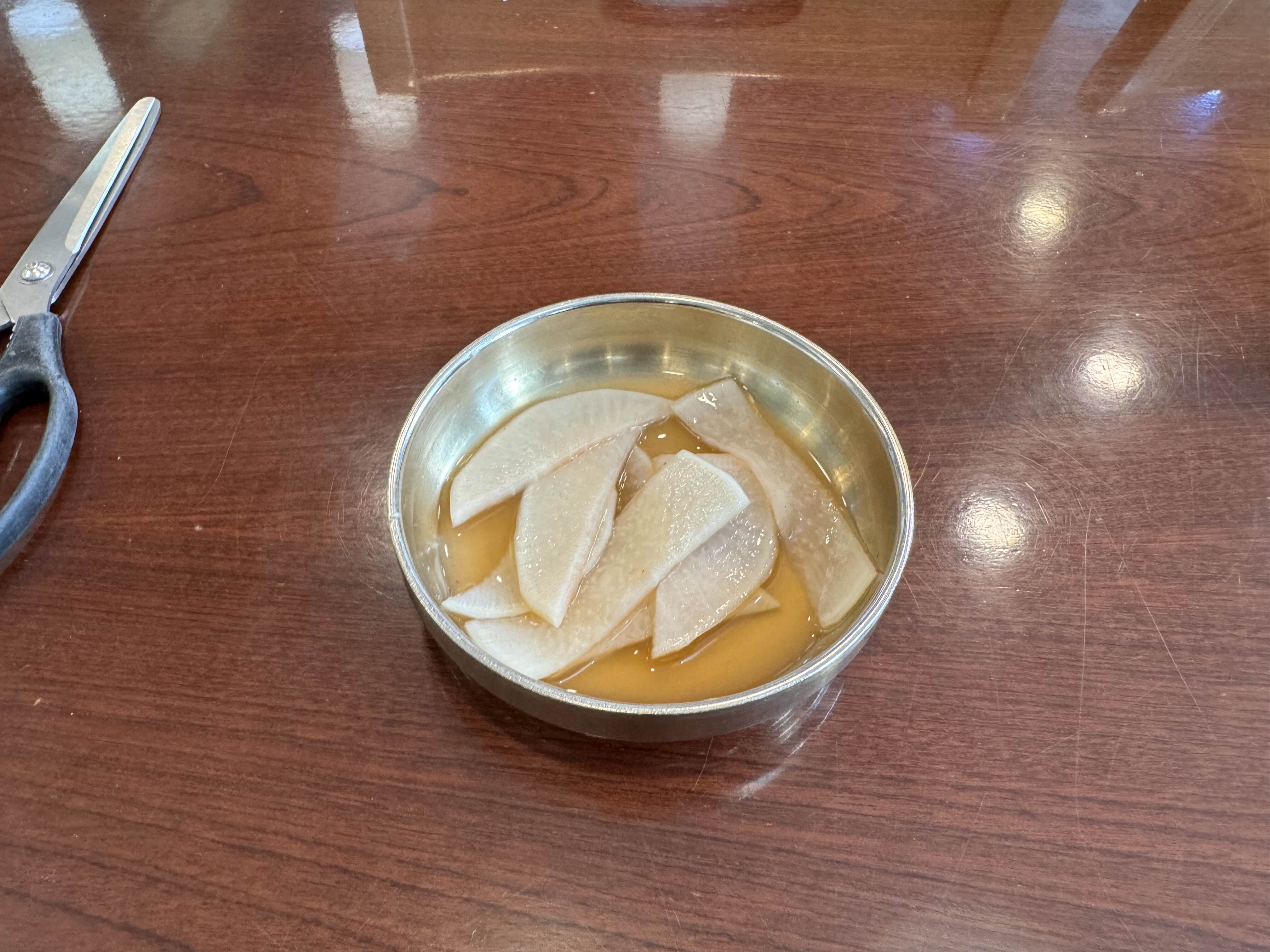 기본찬으로는 무절임이 나오는데 너무 물컹거렸습니다.