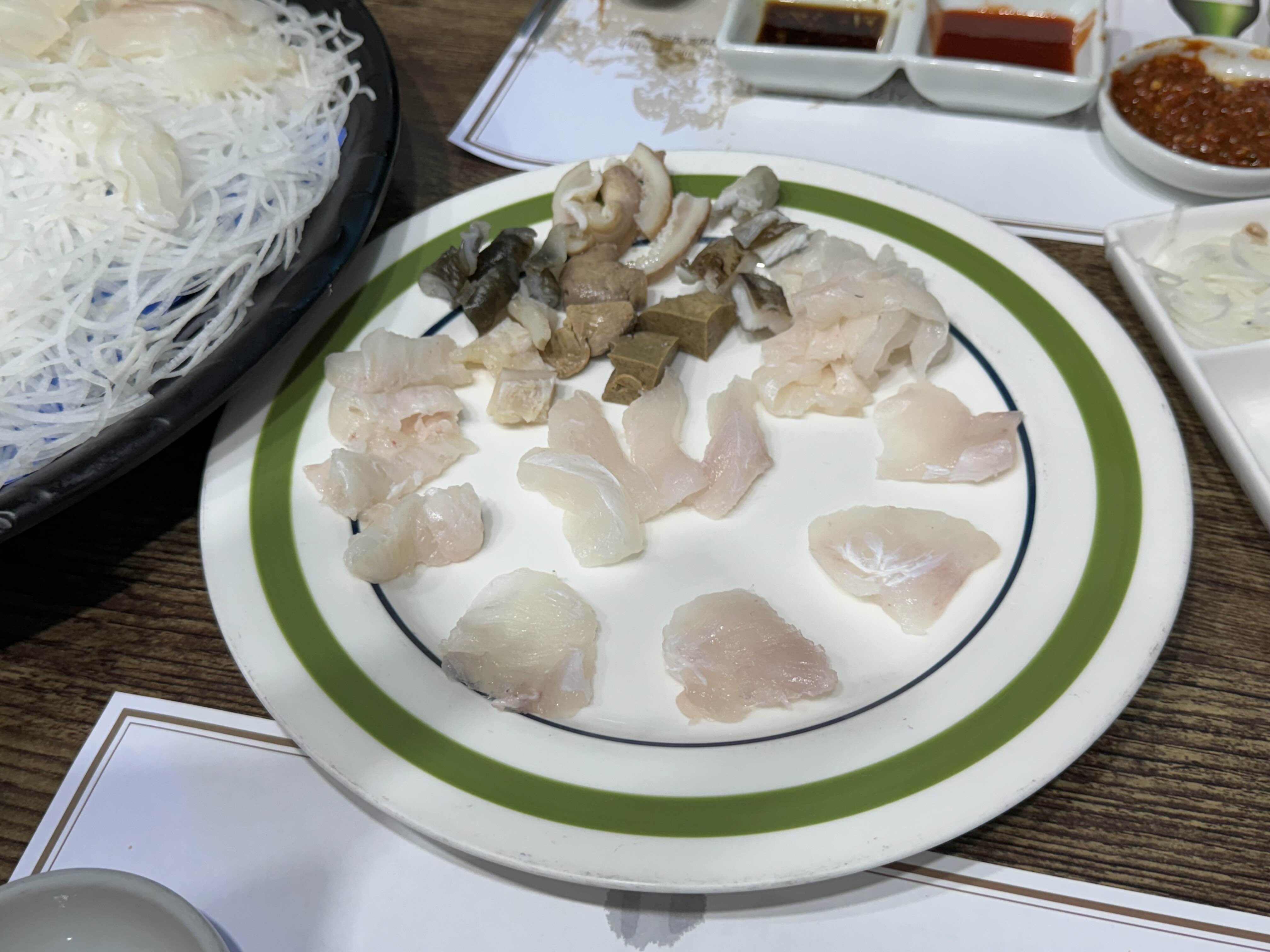 진미명가의 다금바리회가 나왔습니다. 세로마다 부위가 다른듯 합니다. 제일 오른쪽은 뱃살부위 같습니다. 부드럽고 고소한 맛이 좋았습니다. 나머지 부위들은 각각의 맛이 다 달라 신기했습니다. 역시 생선은 클수록 다양한 맛이 나는 것 같습니다.