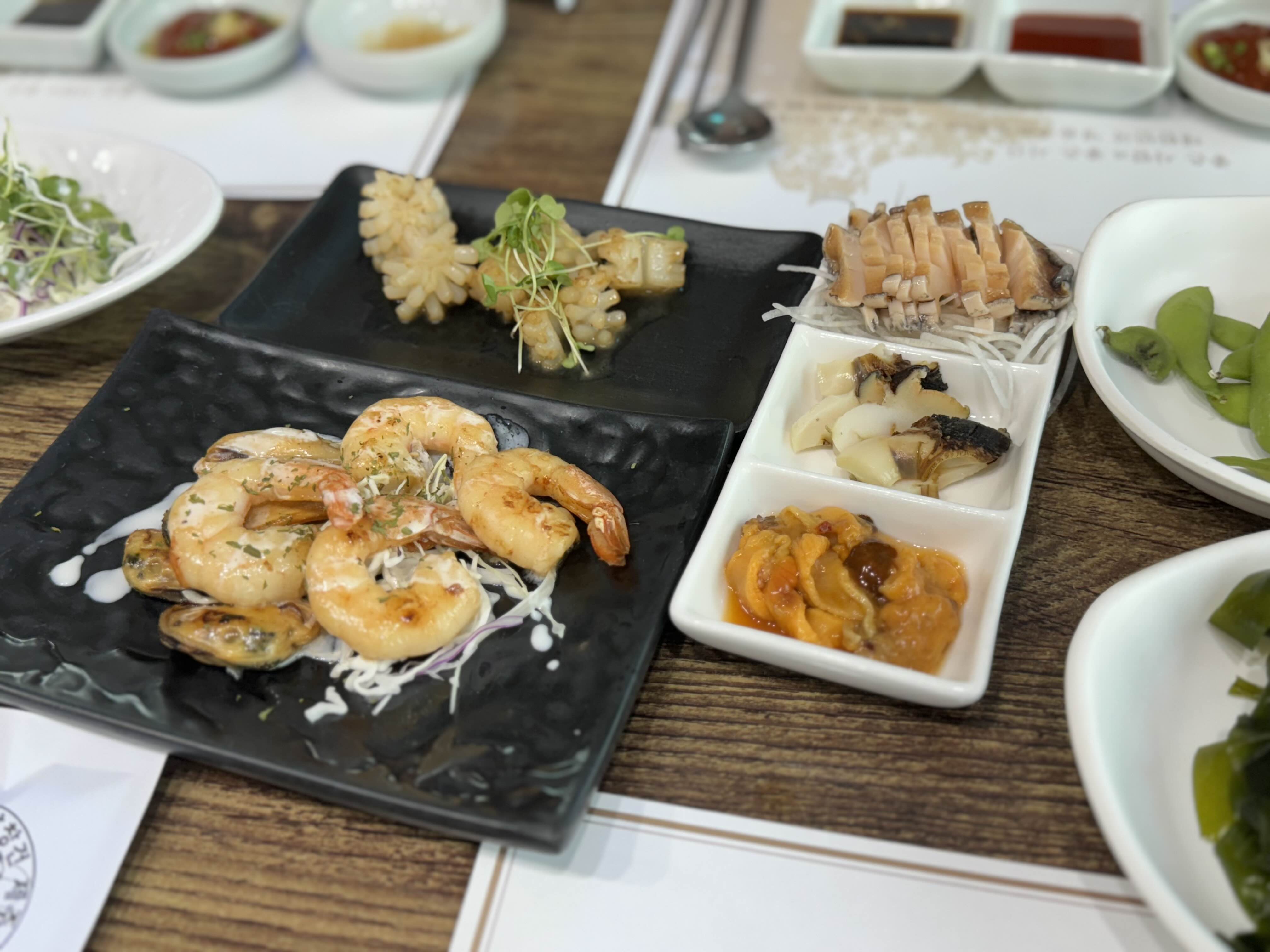 버터새우, 버터오징어, 전복회, 찐 소라, 멍게가 뒤이어 나왔습니다. 버터 새우는 버터향이 많이 나고 맛있었는데 버터오징어는 좀 밍밍했습니다. 전복회는 괜찮았고 찐 소라가 맛있었습니다. 멍게는 먹지 않아 모르겠습니다.