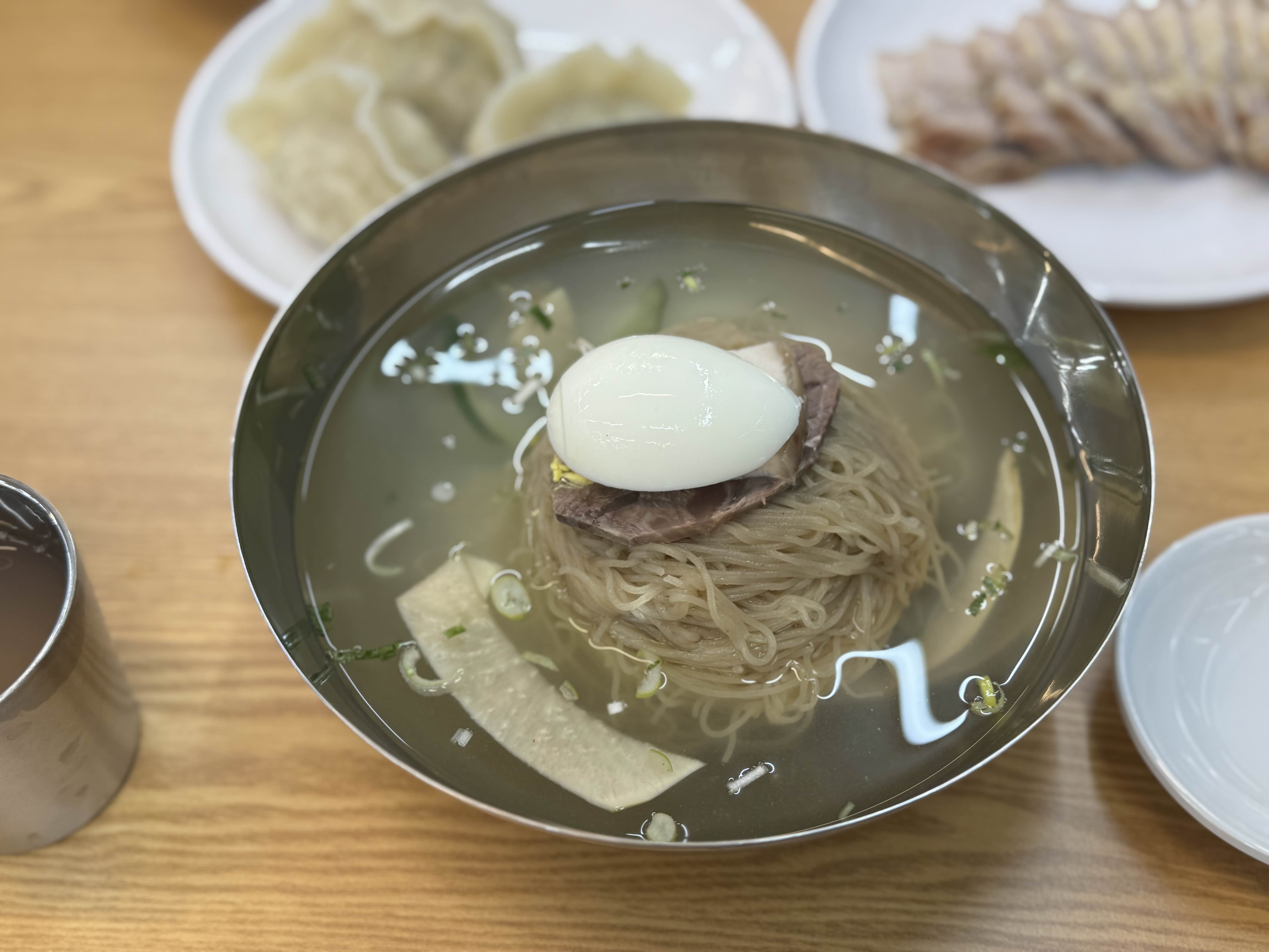 맑은 육수는 염도가 너무 높았습니다. 짠맛이 지배적이고 육향 등 다른 맛이 나지 않고 은은하게 느끼한 맛이 났습니다. 면을 푸니까 염도는 좀 잡혔는데 진짜 육향이나 동치미 맛이 전혀 나지 않고 은은하기 느끼한 조미료 같은 맛이 나서 별로였습니다.