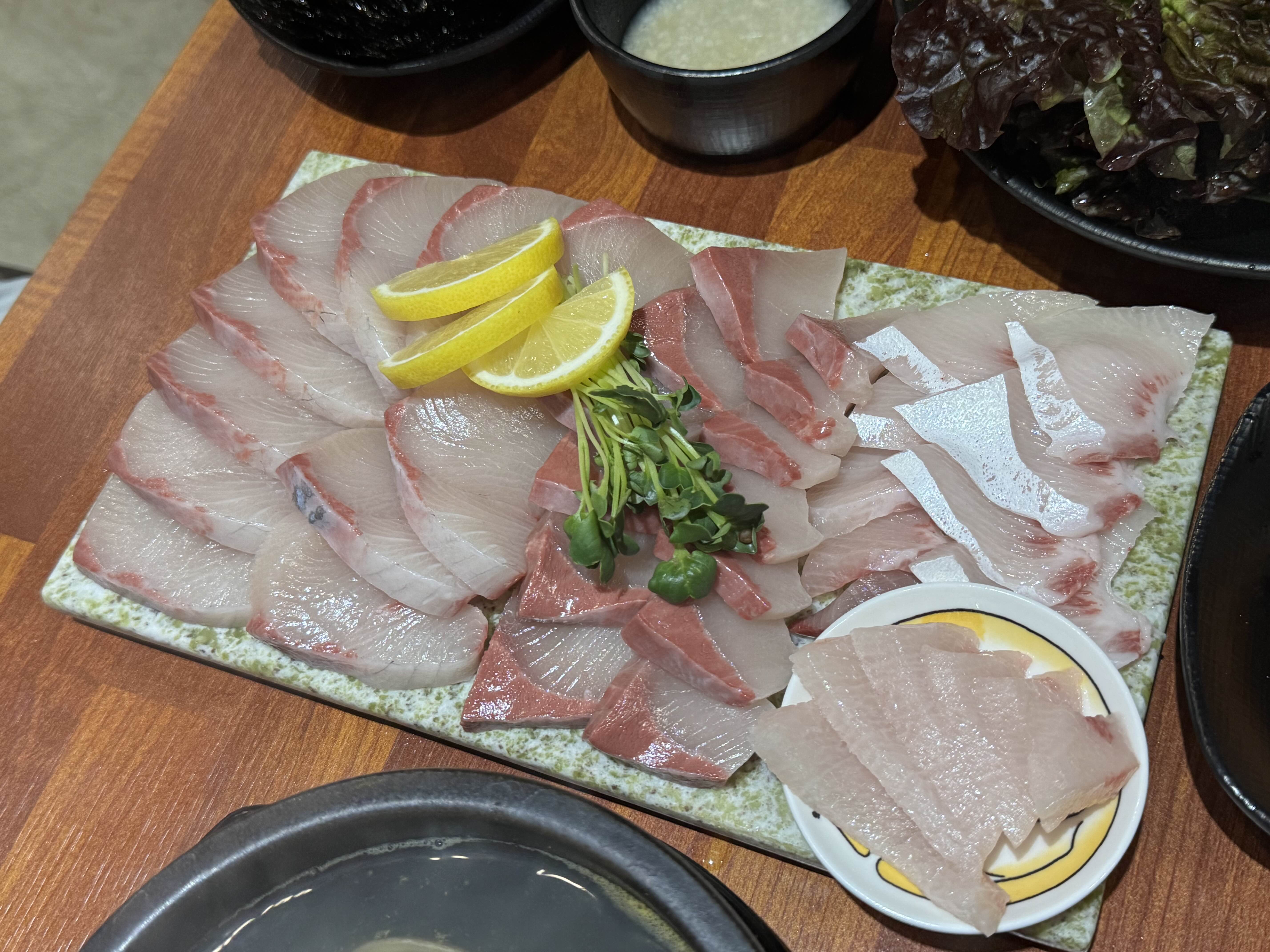 등살은 담백하고 뱃살은 기름기가 아주 꽉 차서 좋았습니다. 서걱거리면서도 그 풍부한 지방감이 참치를 먹는 느낌이었습니다.