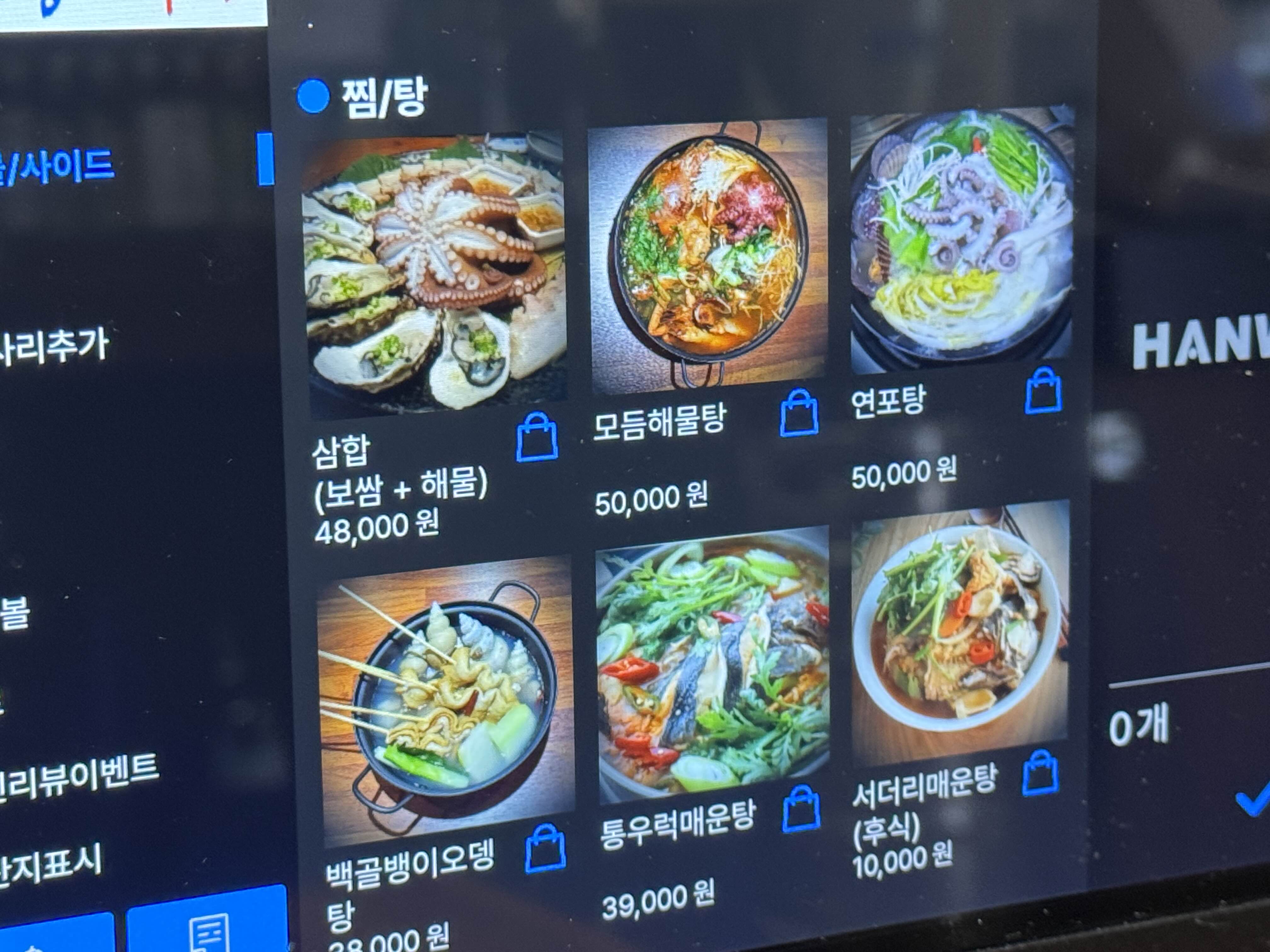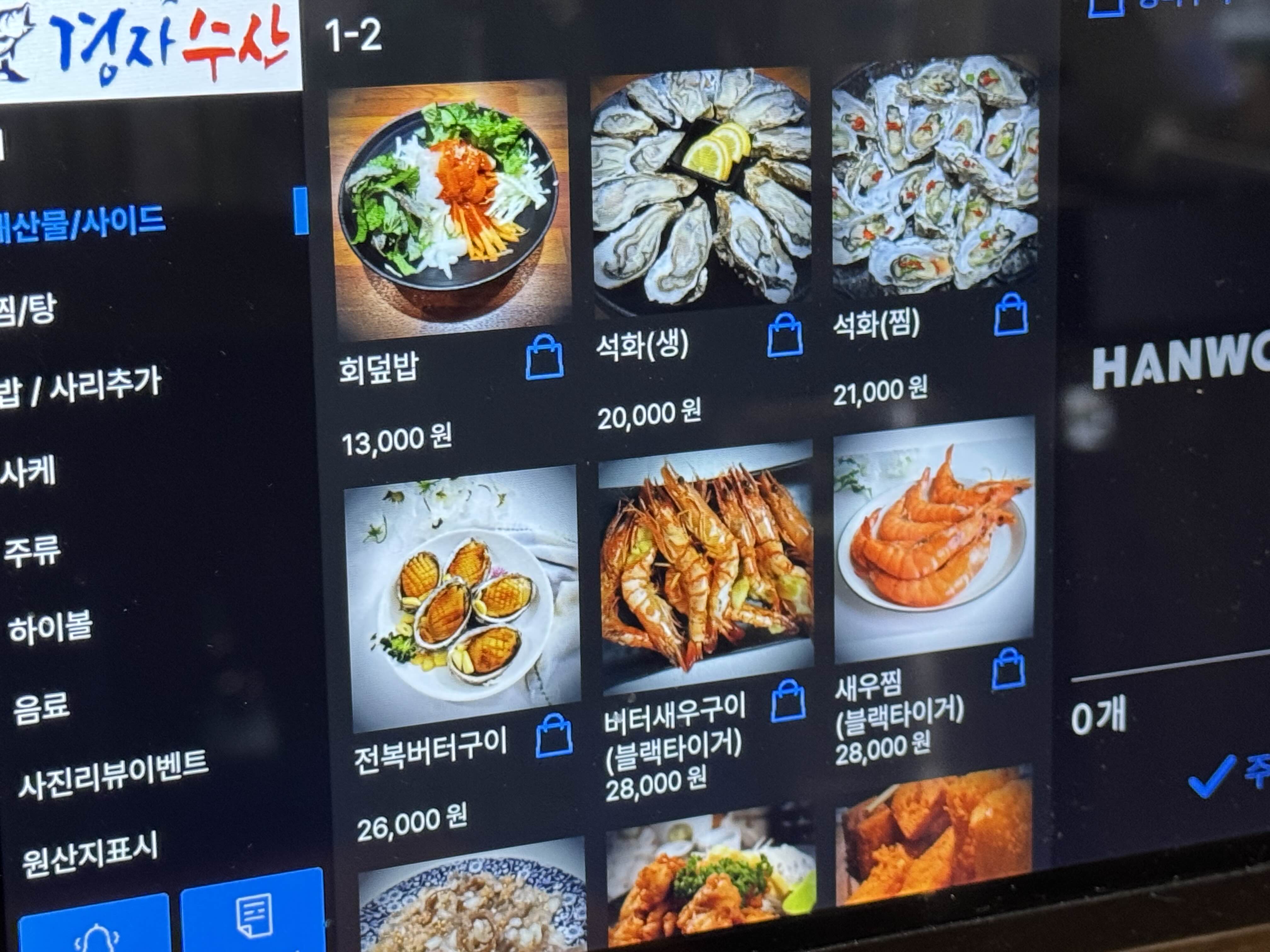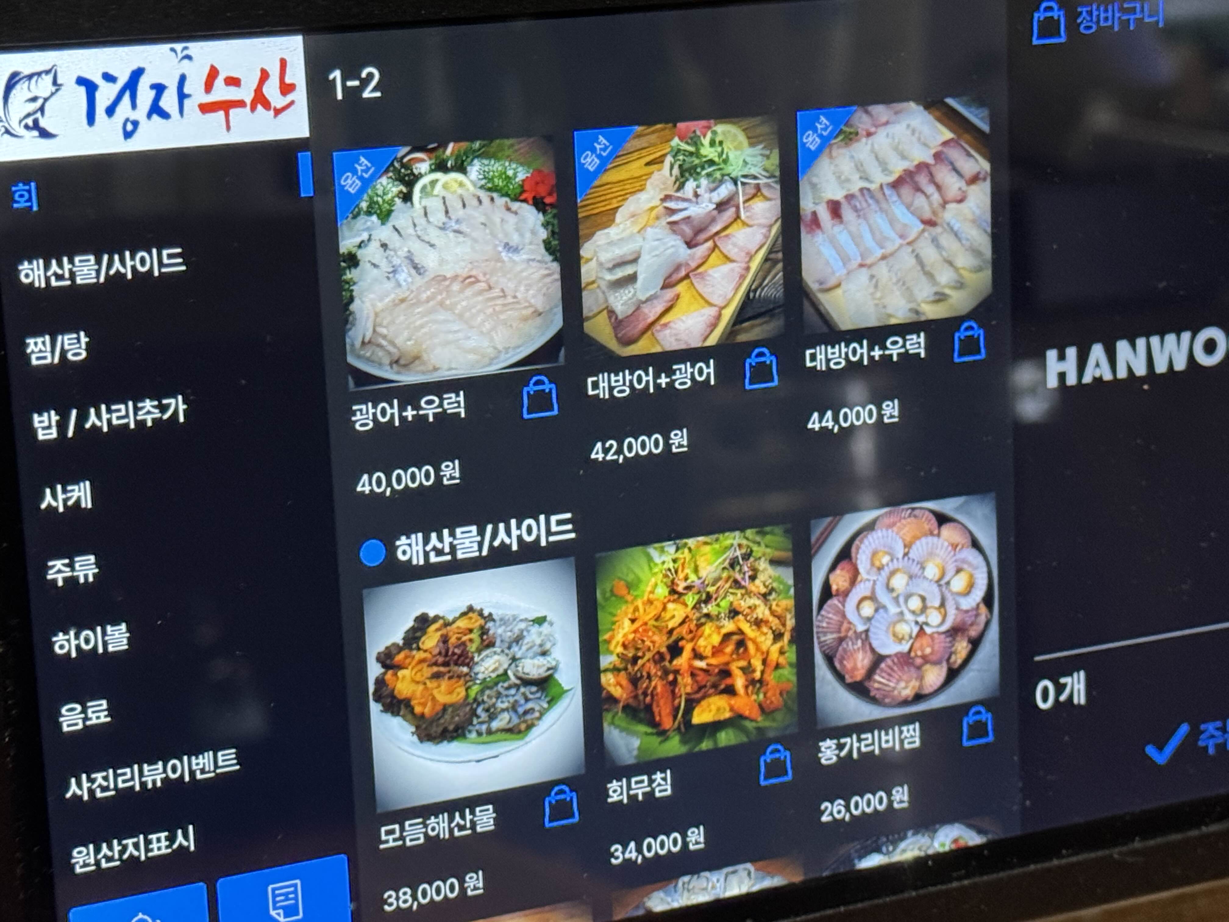 대방어, 우럭, 참돔, 광어, 딱새우회의 회종류와 대방어+우럭, 대방어+광어, 모듬회도 있습니다. 모듬 해산물, 홍가리비, 매운탕, 연포탕, 물회 등 다양한 해산물요리와 더불어 치킨 가라아게와 새우튀김도 판매중입니다.