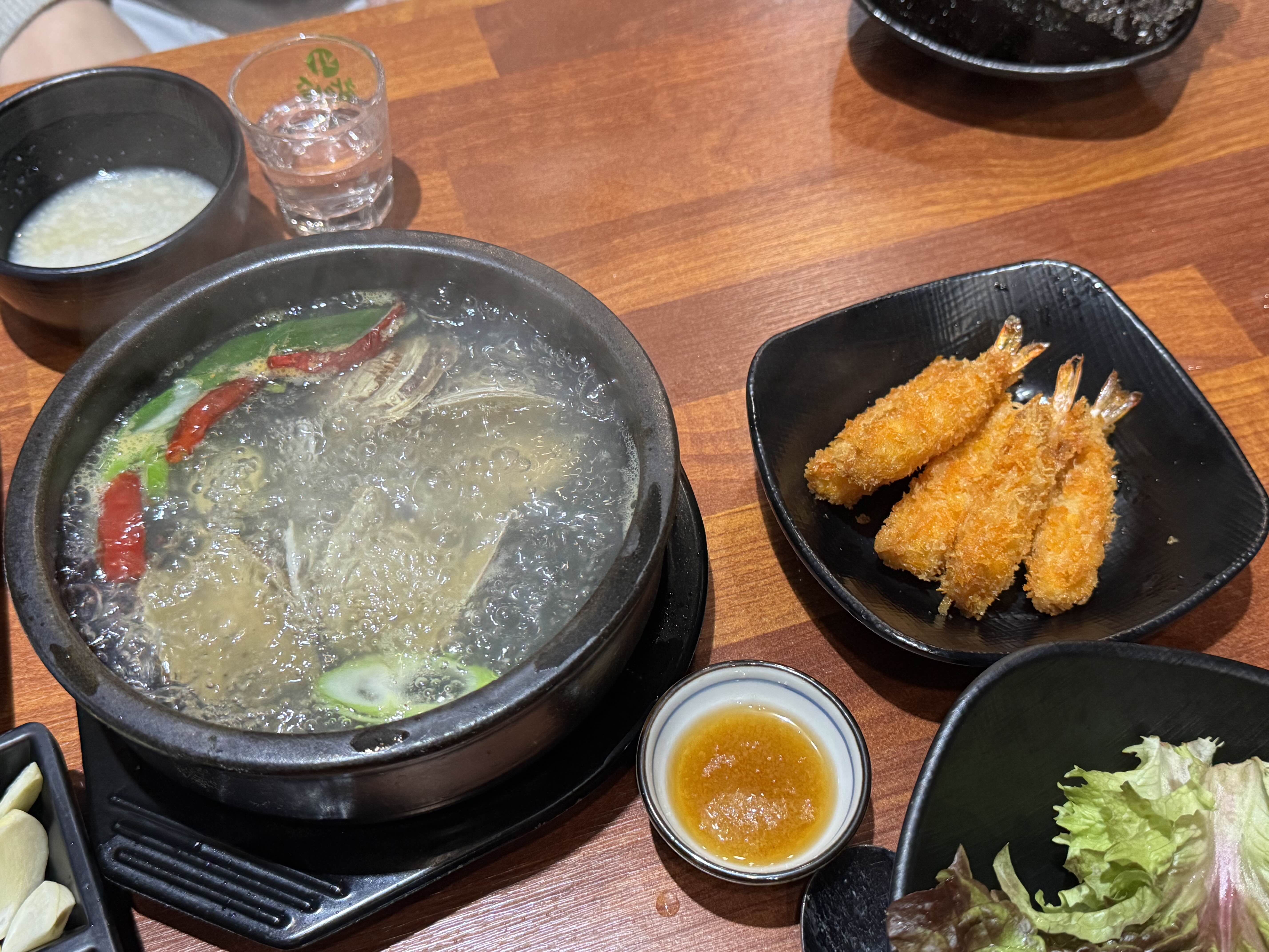 뒤이어 새우튀김과 조개탕도 기본찬으로 나옵니다. 새우튀김은 무난하게 맛이 괜찮았고 조개탕엔 백합으로 보이는 조개가 6개정도 들어있었습니다. 국물은 조개향이 확 나고 칼칼한게 술안주로 아주 좋았습니다. 8천원정도에 팔아도 될 정도입니다.