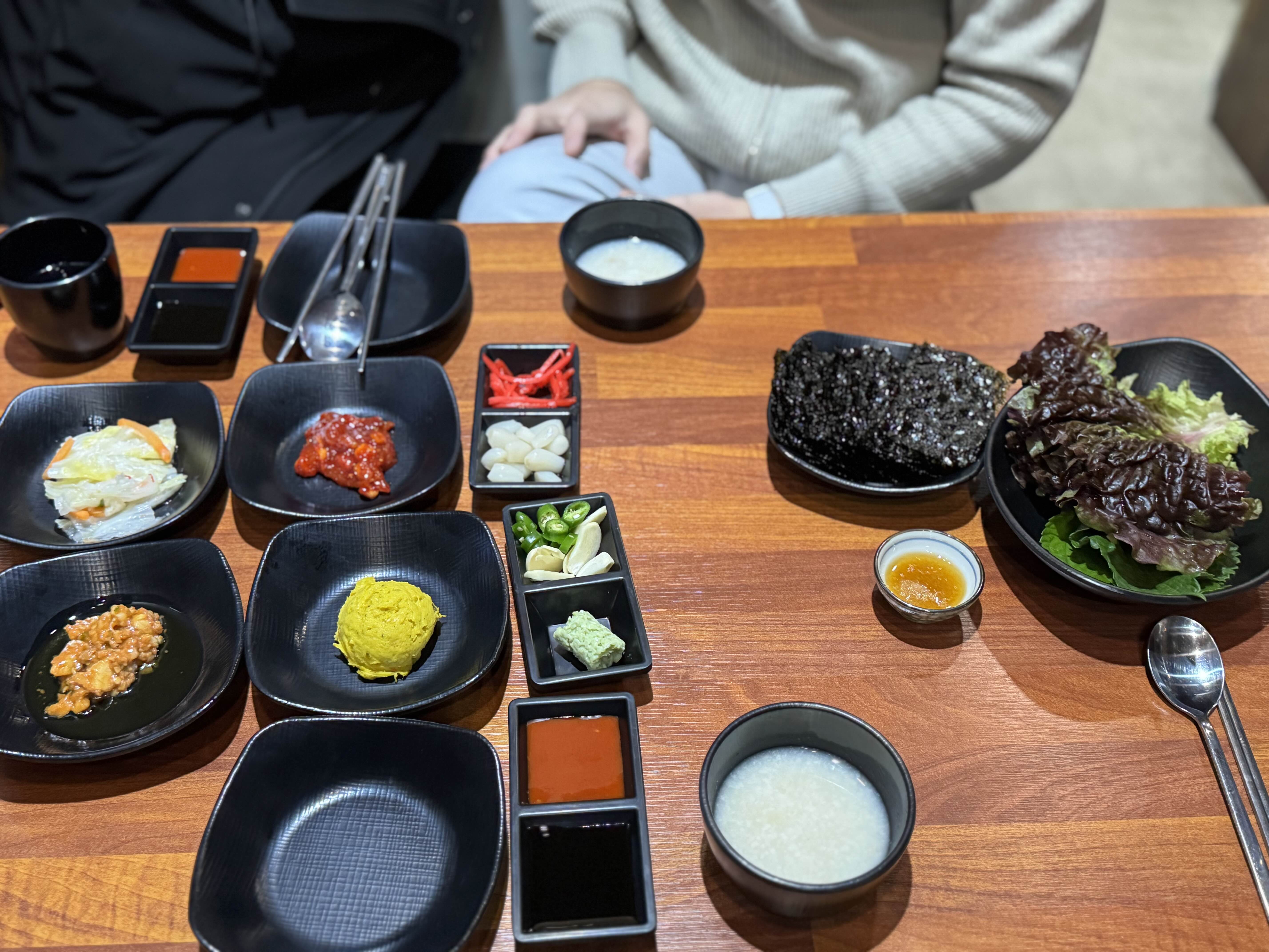 상추, 깻잎, 김, 오징어젓갈, 단호박샐러드, 쌈장, 백김치, 흰죽이 기본찬으로 나옵니다.