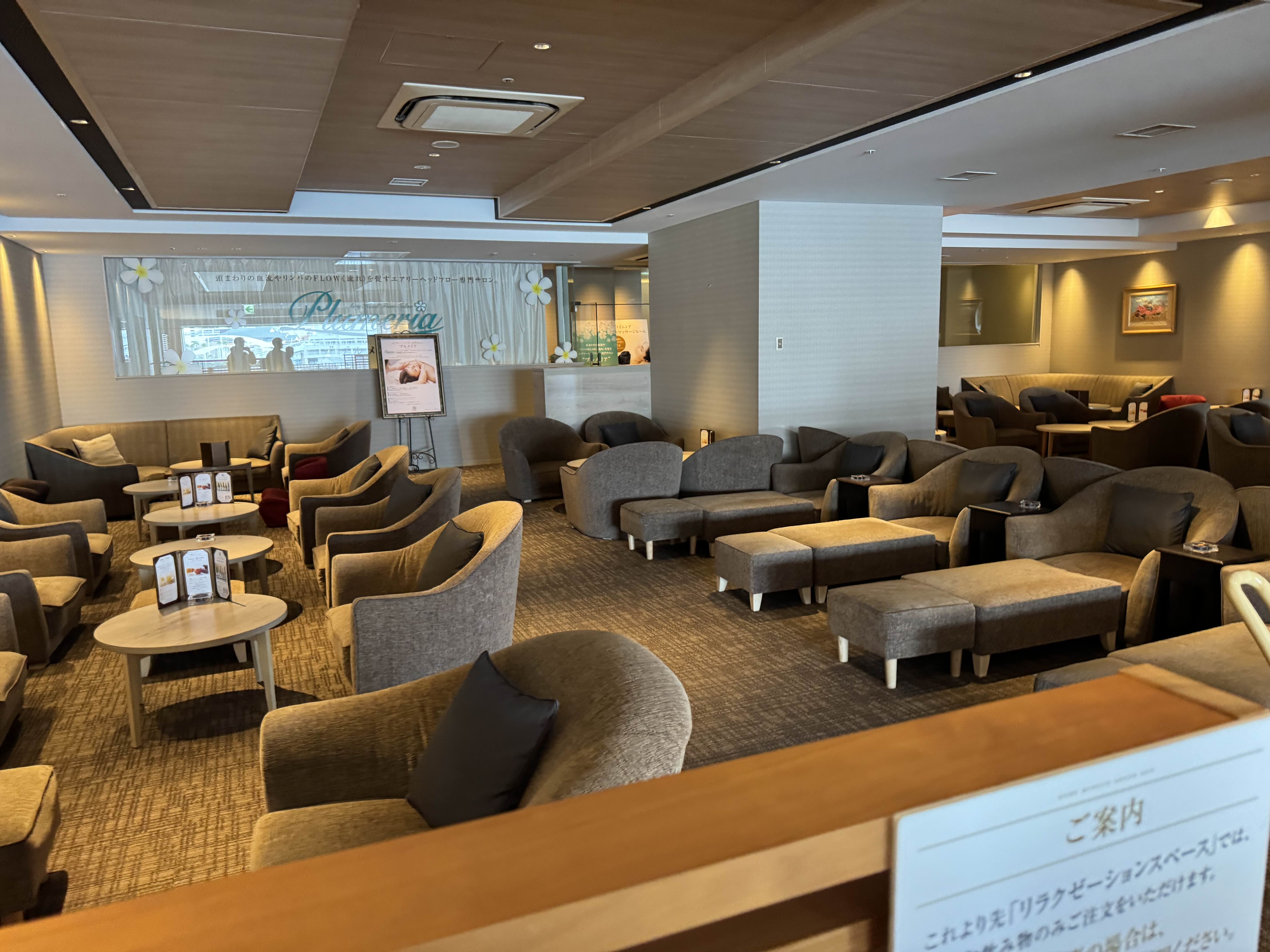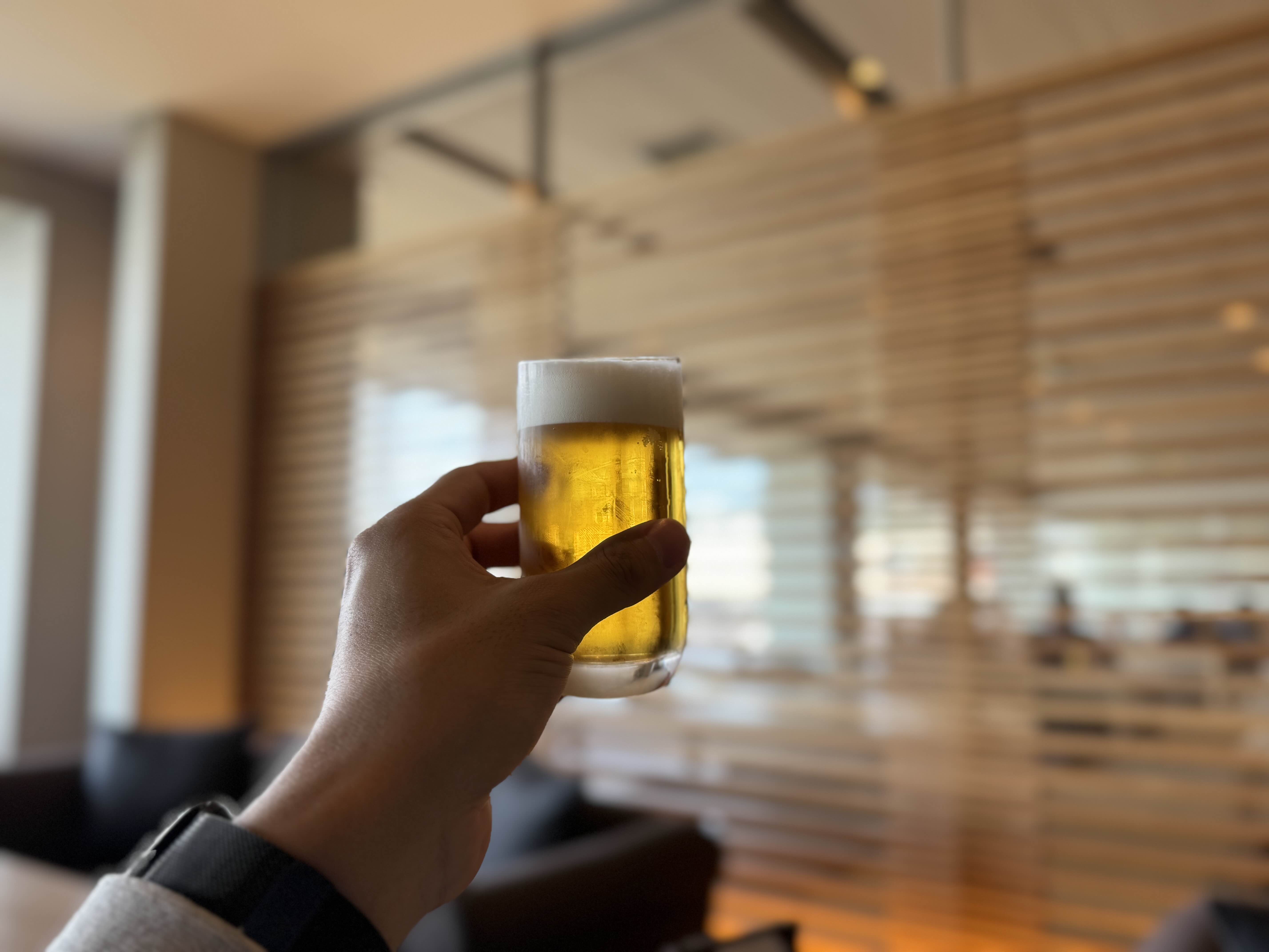 라운지에는 여러 식당이 있고 편안하게 쉴 공간도 있습니다. 자리를 잡고 입장할 때 받은 종이를 들고 음료를 주문하면 됩니다. 커피, 쥬스 등과 함께 생맥주도 있어 생맥주로 주문했습니다.