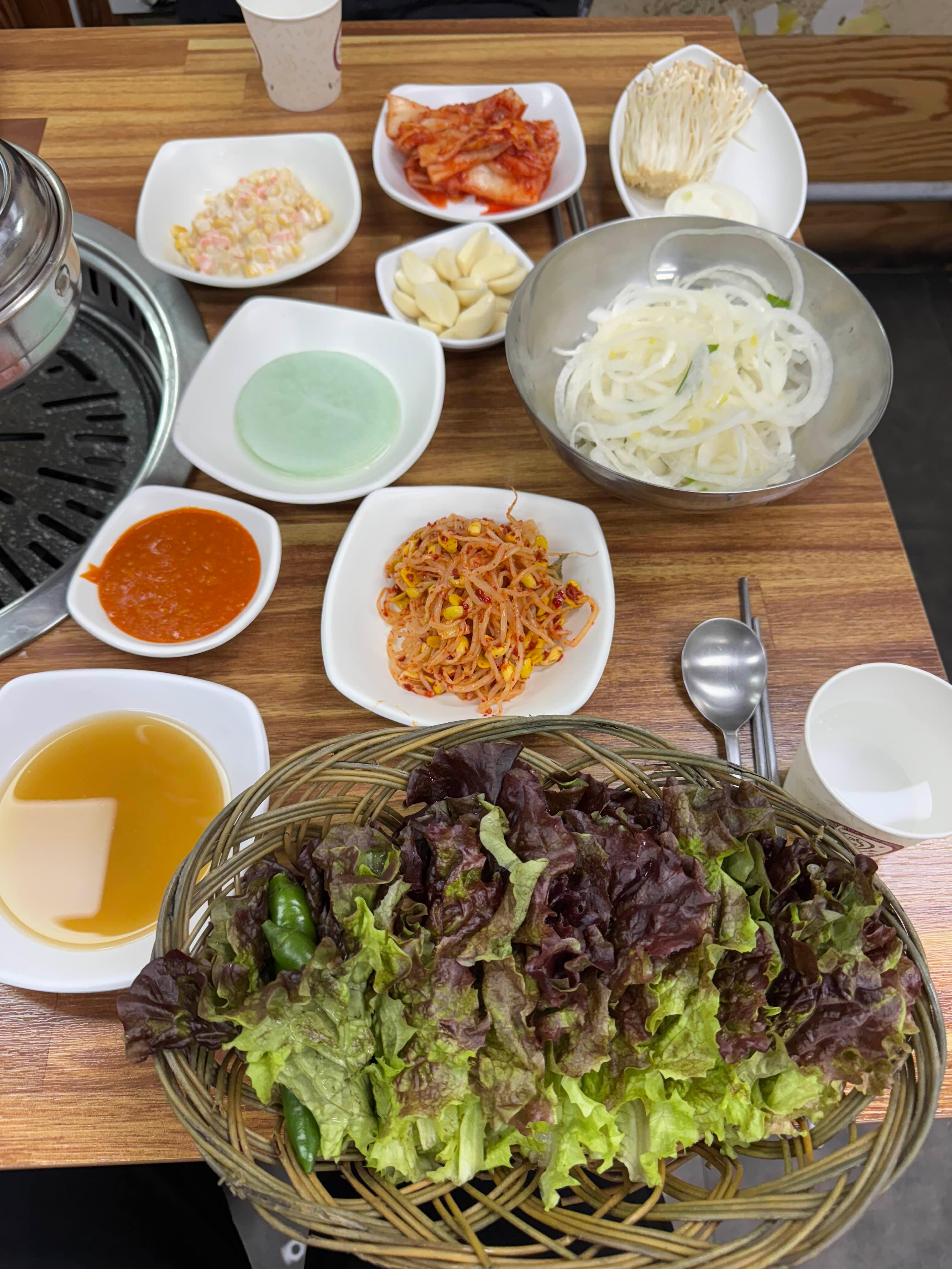 상추와 고추, 콩나물무침, 양파, 쌈무, 마늘, 팽이버섯, 배추김치와 콘샐러드가 기본찬으로 나옵니다. 김치와 콩나물무침은 구워먹어도 맛있습니다.