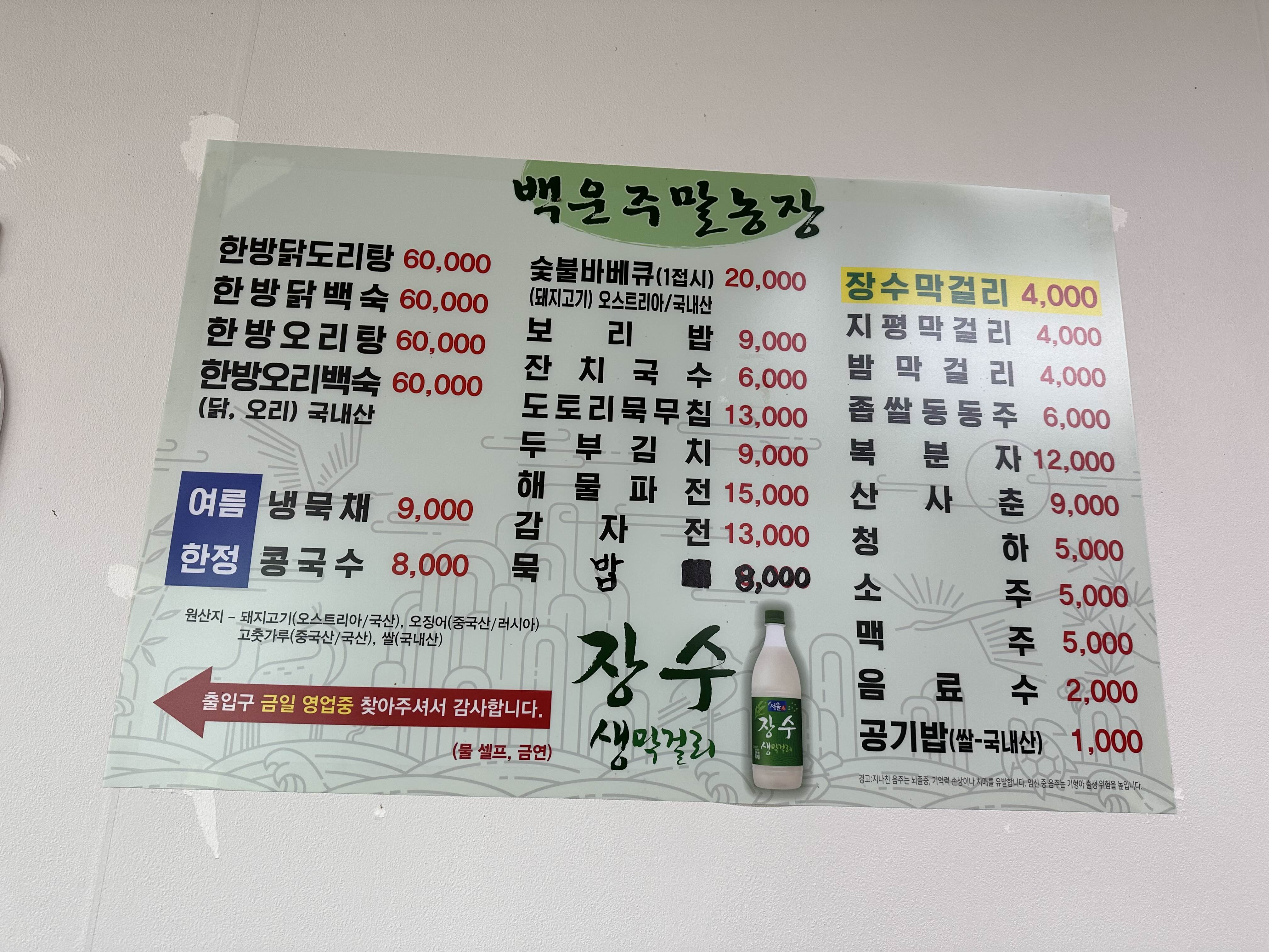 메뉴입니다. 백숙은 미리 예약을 해야해서 힘들고