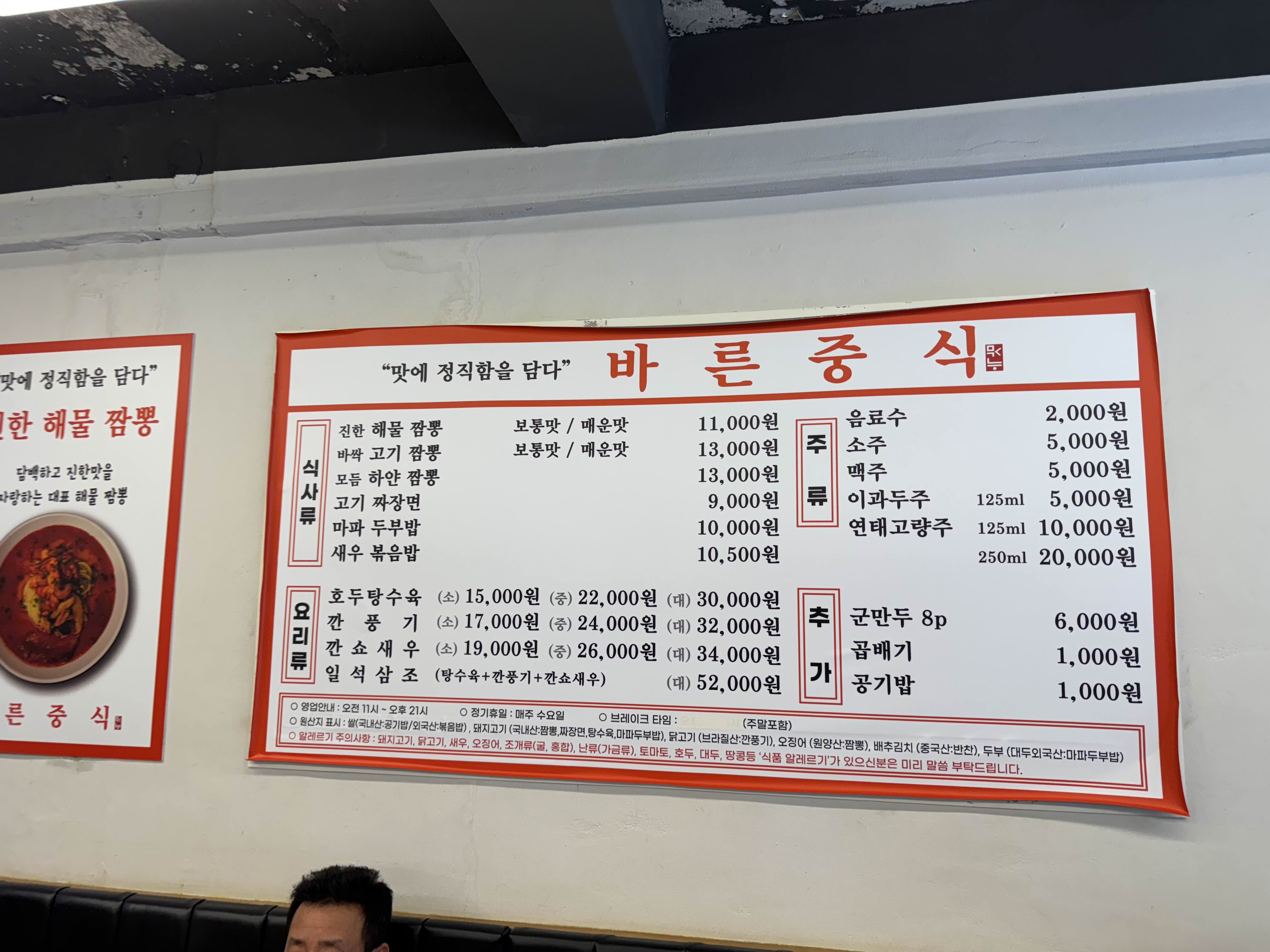 진한 해물짬뽕, 바싹 고기짬뽕은 보통맛, 매운맛이 있고 하얀짬뽕, 고기짜장면, 마파 두부밥, 새우볶음밥의 식사메뉴와 요리류는 호두탕수육, 깐풍기, 깐쇼새우를 판매중입니다.
