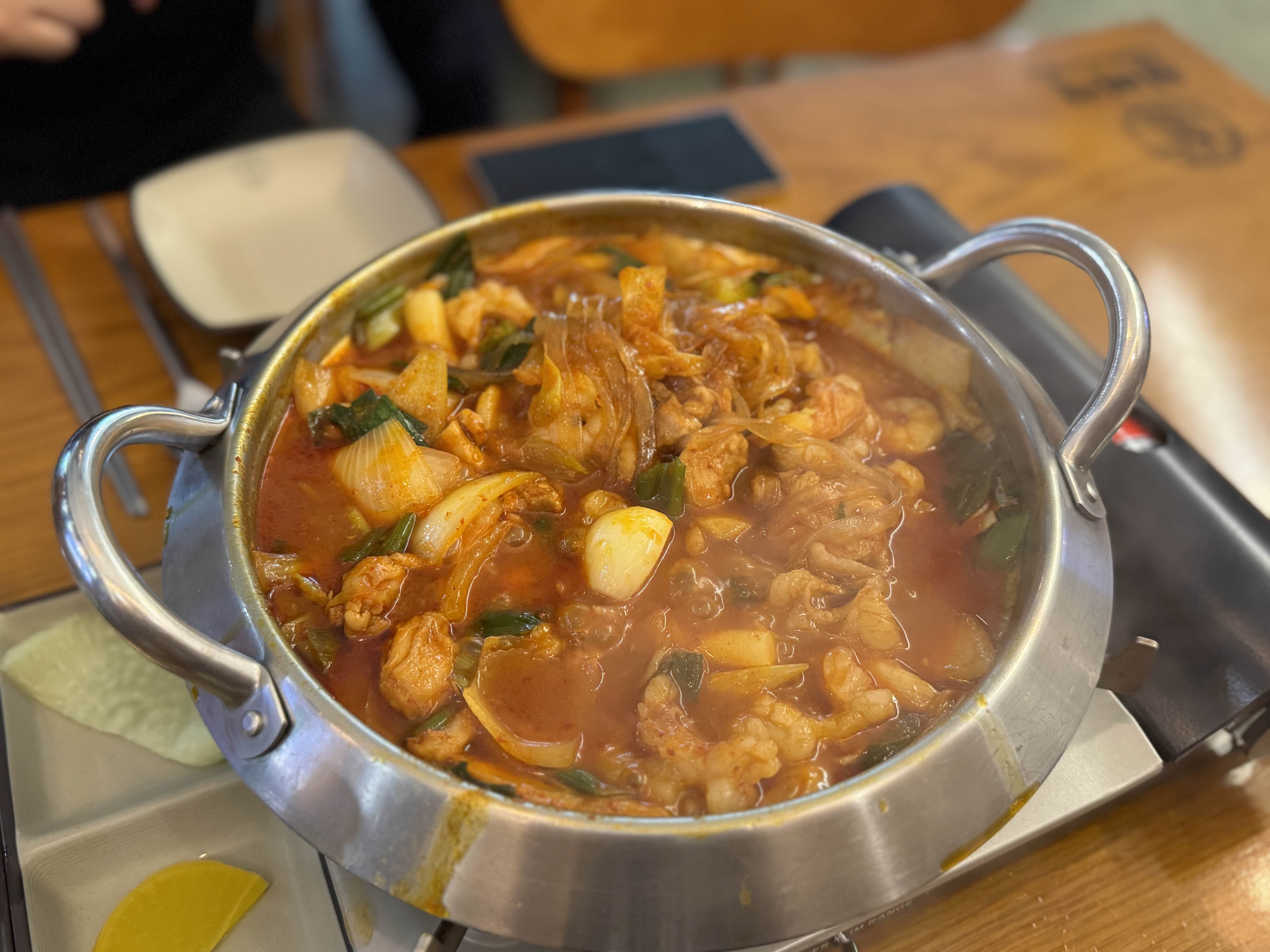 반조리 상태로 나오고 직원분이 다 익을때까지 조리를 도와주십니다. 일반당면과 중국당면 사이의 약간 넓적당면과 채소들도 많이 들어있고 닭고기, 새우, 대창도 많이 들어있습니다. 1인분당 가격이 꽤 있는만큼 양이 꽤 됩니다.