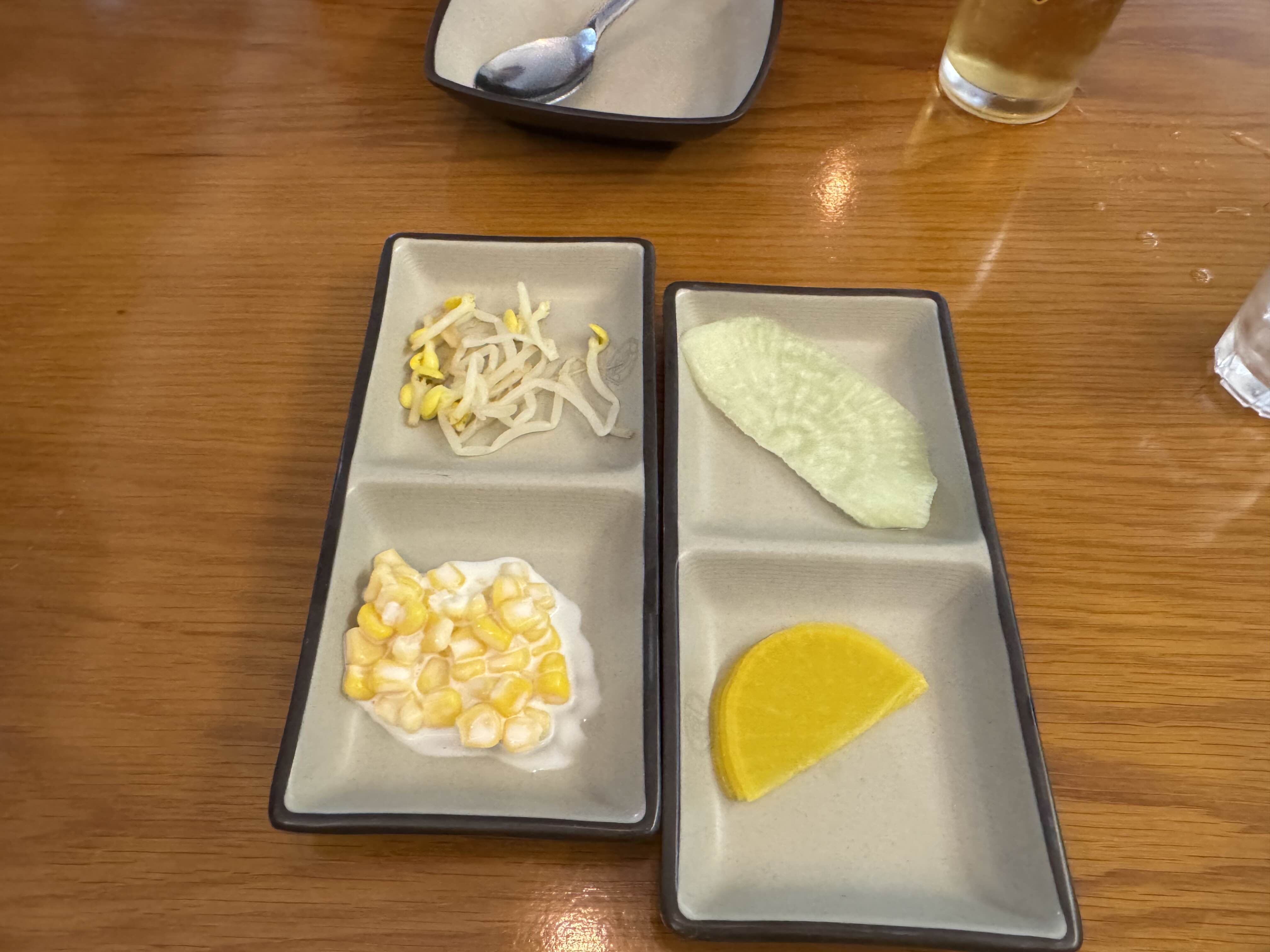 밑반찬으로 콩나물, 콘샐러드, 쌈무, 단무지가 나옵니다.