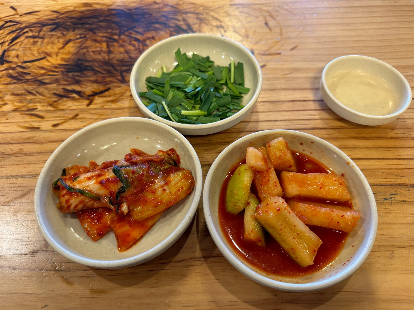 부추와 배추김치, 깍두기가 나옵니다.